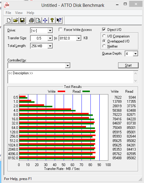 Для более детального измерения производительности HDD-диска Apple HDD HTS545050A7E362, установленного в iMac (Mid 2014), мы также воспользовались известной утилитой ATTO Disk Benchmark (под Windows 8). Данная утилита определяет максимальную скорость последовательного чтения и записи на уровне 85 МБ/с.