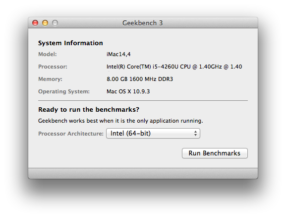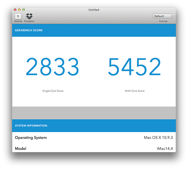В тесте Geekbench 3, измеряющем производительность процессора и оперативной памяти, 21,5-дюймовый iMac (Mid 2014) получил 5452 балла в двухъядерном режиме и 2833 балла в одноядерном режиме.