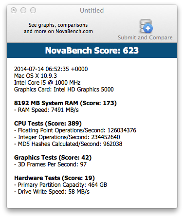 В комплексном бенчмарке Novabench 21,5-дюймовый моноблок iMac (Mid 2014) набрал 623 балла.