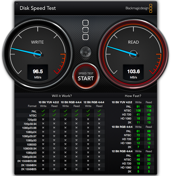 Последний тест — Blackmagic Disk Speed Test, измеряющий производительность накопителя. Увы, в этом тесте младший iMac (Mid 2014), как и следовало ожидать, не впечатляет: скорости чтения и записи находятся на уровне 100 МБ/с, что, конечно же, по сегодняшним меркам очень мало.