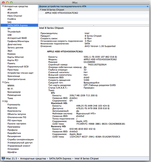 Что касается накопителя, то в младшей модели нового iMac установлен жесткий диск Apple HDD HTS545050A7E362 объемом 500 ГБ. Опционально возможна конфигурация с HDD-диском объемом 1 ТБ, а также с гибридным накопителем Fusion Drive емкостью 1 ТБ либо SSD-накопителем емкостью 256 ГБ.