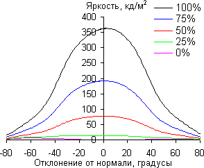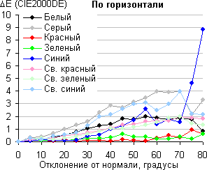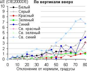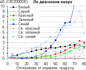 Из графиков следует, что при отклонении на уровне 45° ΔE меньше 3 для большинства из 8 протестированных цветов, и только в одном случае отклонение для светло-синего цвета немного превышает эту отметку. Незначительный сдвиг цветов при отклонении взгляда от перпендикуляра к экрану является характерным признаком матриц типа IPS.