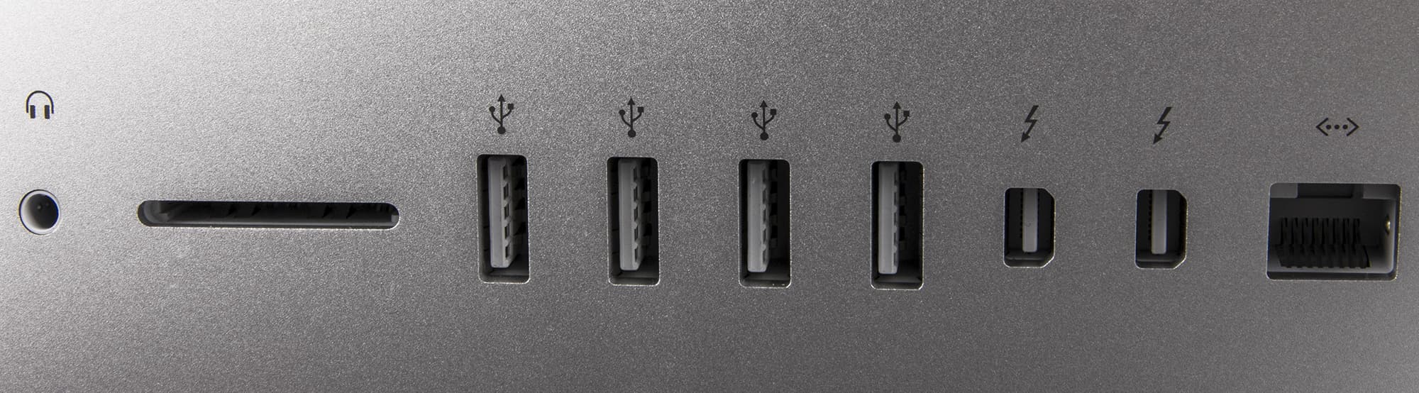 И здесь еще надо учесть, что в iMac инженеры смогли разместить все комплектующие мощного компьютера, включая систему охлаждения и пр.! Так что победитель этого сравнения очевиден. Но вернемся к дизайну iMac. Как и у прошлогодней модели, все порты здесь расположены сзади, а их набор идентичен: четыре USB 3.0, два Thunderbolt, разъем Ethernet, слот для карт памяти SD/SDXC и гнездо для наушников 3,5 мм.