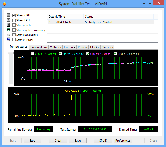 При загрузке процессора тестом Stress CPU (утилитой AIDA64 Extreme Edition — тест на стабильность системы), который использует целочисленные вычисления, частота процессора составляет 3,7 ГГц. Температура процессора в этом режиме загрузки увеличивается до 75 °С.