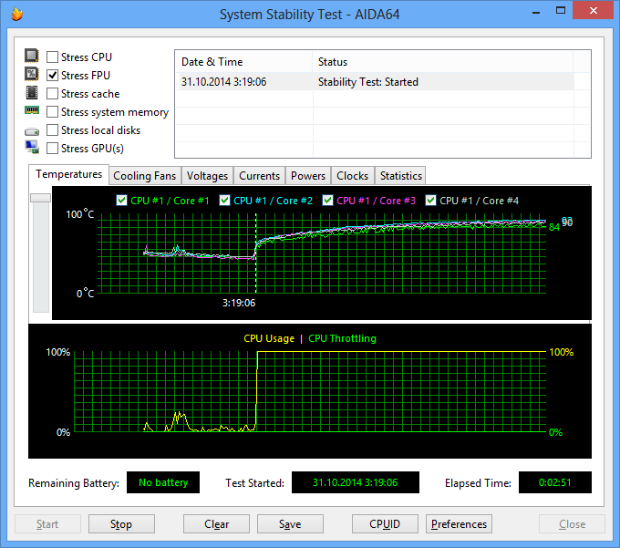 При нагрузке процессора тестом Stress FPU, который использует вычисления c плавающей точкой и в большей степени нагревает процессор, максимальная частота процессора составляет 3,5 ГГц, а температура его ядер увеличивается до 85 °С.