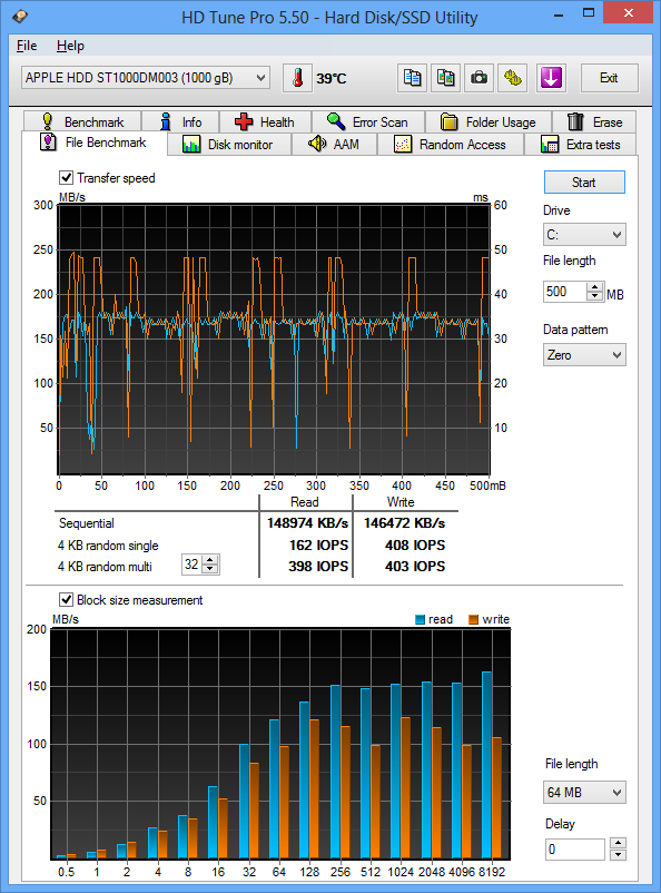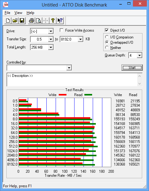 Утилита ATTO Disk Benchmark определяет максимальную скорость последовательного чтения на уровне примерно 165 МБ/с, а скорость последовательной записи — на уровне примерно 160 МБ/с.