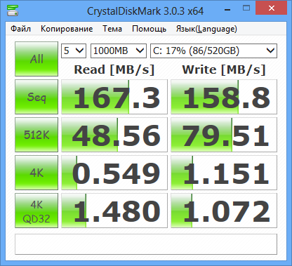 Утилита CrystalDiskMark дает примерно такие же результаты.