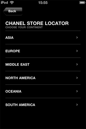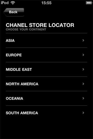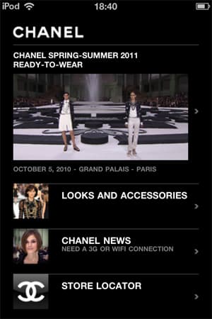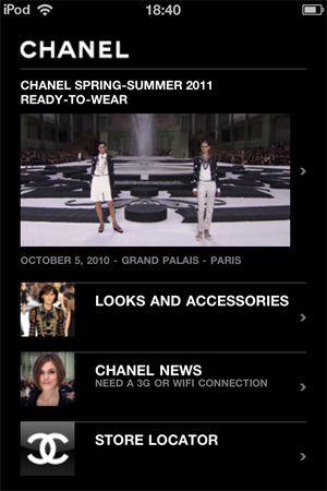 Почему spring-summer 2011? Потому что почти весь контент приложения посвящен именно весенне-летней коллекции 2011. В приложении три раздела: Looks and accessories, Chanel News и Store Location. Кроме того, на главной странице приложения размещен стандартный полутораминутный видеоролик с показа весенне-летней коллекции 2011.