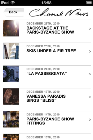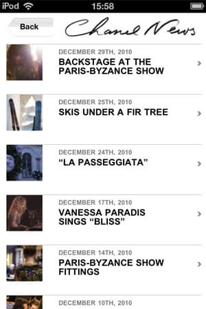 Второй раздел — Chanel News — подгружается из интернета и, соответственно, требует наличия сети Wi-Fi или 3G. К счастью, новости представляют собой не просто сухие (или же восторженные) строки пресс-релизов. Там могут быть бэкстэйдж-фотографии показов, развернутые интервью (например, на момент написания статьи там было совместное интервью Карла Лагерфельда и Ванессы Паради), видеоролики и прочие «вкусности».