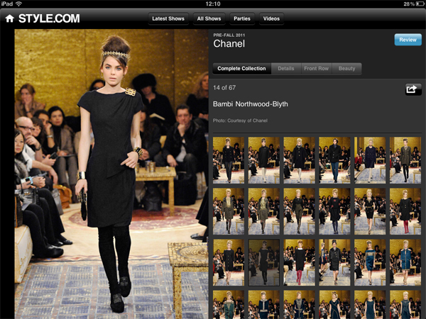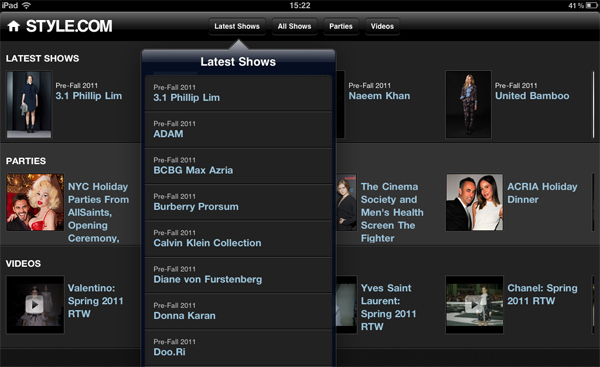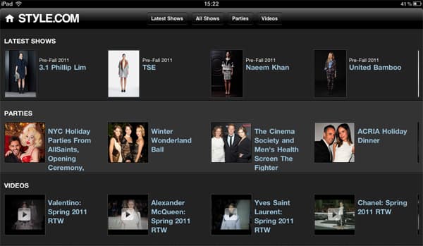Итак, как же организовано приложение Style.com? Меню (горизонтальное и вертикальное в iPad, только вертикальное в iPhone) состоит из шести пунктов: Style Videos (видеоролики), Fashion Shows (модные показы), Parties (светская жизнь), Men’s Fashion (модные показы мужской одежды), Style File Blog (блоггерские заметки). Коллекции можно выбирать по сезонам (например, Spring 2010, Pre-Fall 2011…) и по брендам в рубрике новейших показов (например, самые последние показы Chanel, Burberry, Fendi и т.п.).