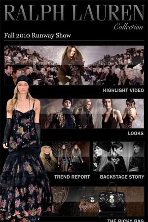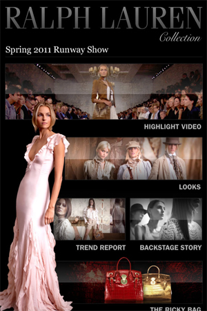 Более серьезно к делу подошли разработчики приложения Ralph Lauren. Во-первых, имеется оптимизация под iPhone 4 (как в интерфейсе, так и в самих фотографиях — их разрешение 960х640), во-вторых, глаз радует более красивое, чем у Chanel, меню, в-третьих — присутствуют миниатюры всех видов коллекции, что облегчает навигацию.