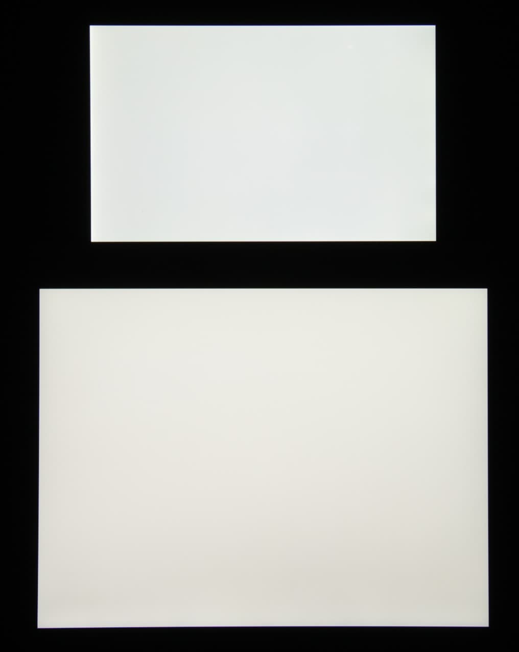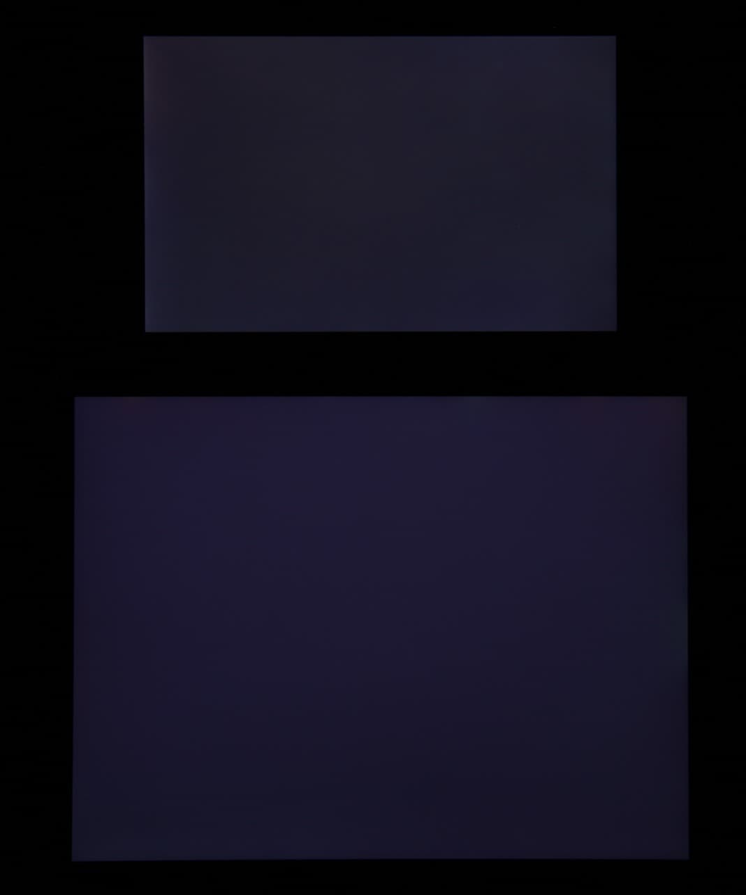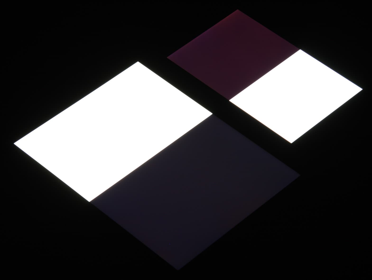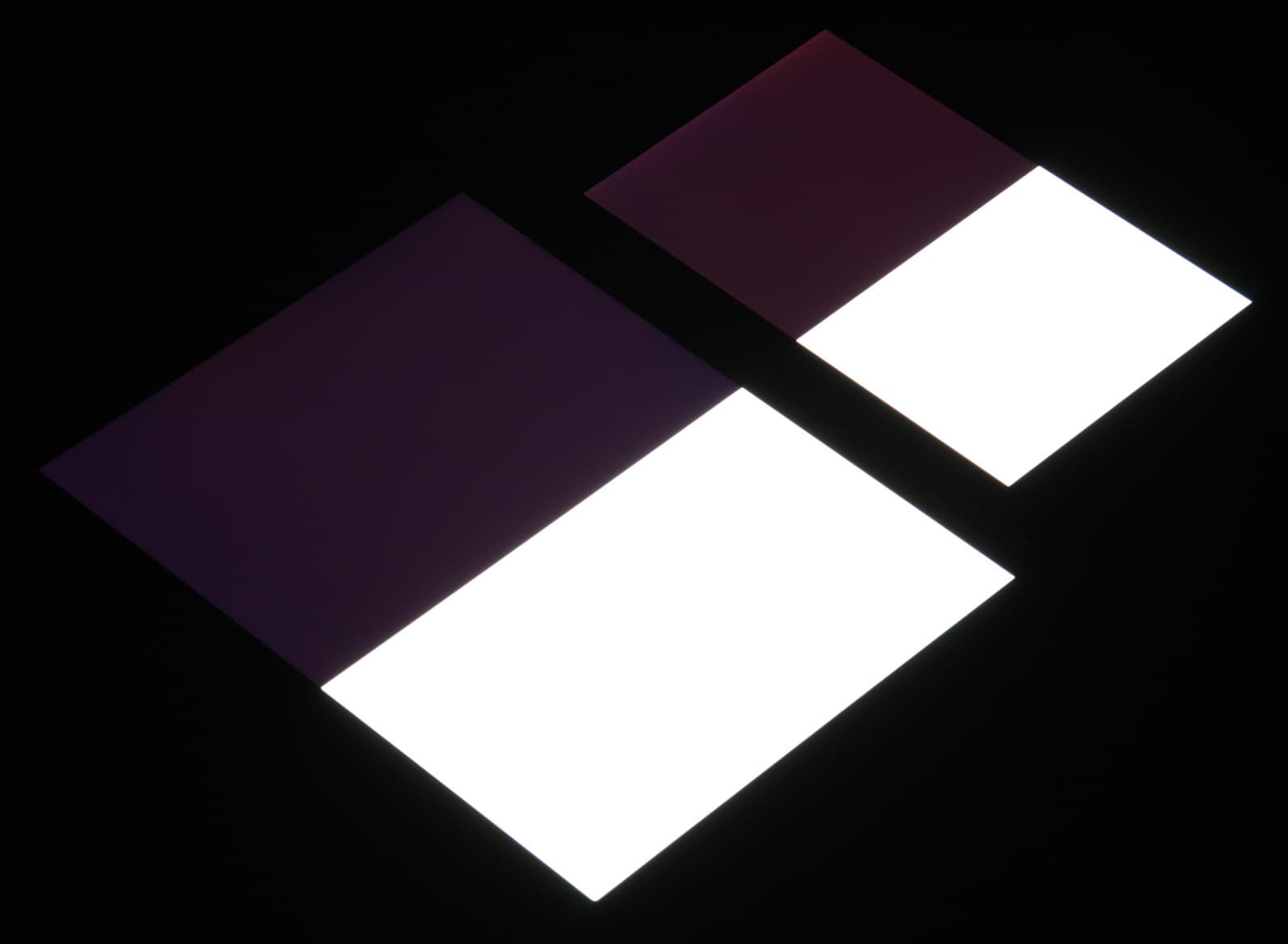 Яркость под углом у экранов уменьшилась (как минимум в 4 раза, исходя из разницы в выдержке), но в случае Apple iPad (A1823) падение яркости меньше. Черное поле при отклонении по диагонали высветляется слабо и приобретает фиолетовый или красно-фиолетовый оттенок. Фотографии ниже это демонстрируют (яркость белых участков в перпендикулярном плоскости экранов направлении примерно одинаковая!):