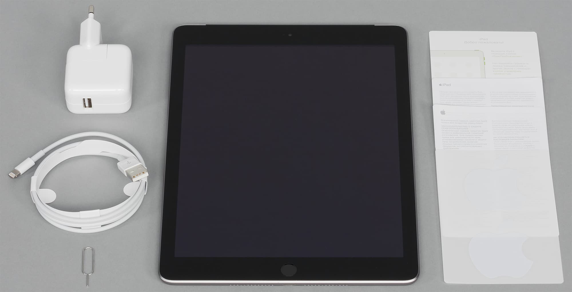 Комплектация самого iPad никаких сюрпризов не сулит: листовки, зарядное устройство, кабель Lightning, наклейки и ключик для извлечения колыбельки SIM-карты. Зарядное устройство имеет такую же мощность, как и у iPad Pro 9,7″: 10 Вт (2,1 А, 5,1 В).