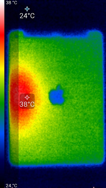 Видно, что нагрев больше локализован у правого края и вертикально примерно по центру, что соответствует расположению микросхемы SoC. По данным теплокамеры, максимальный нагрев составил 38 градусов (при температуре окружающего воздуха в 24 градуса), на один градус ниже, чем в случае большого Apple iPad Pro, и столько же, сколько у Apple iPad Pro с дисплеем 9,7 дюйма.