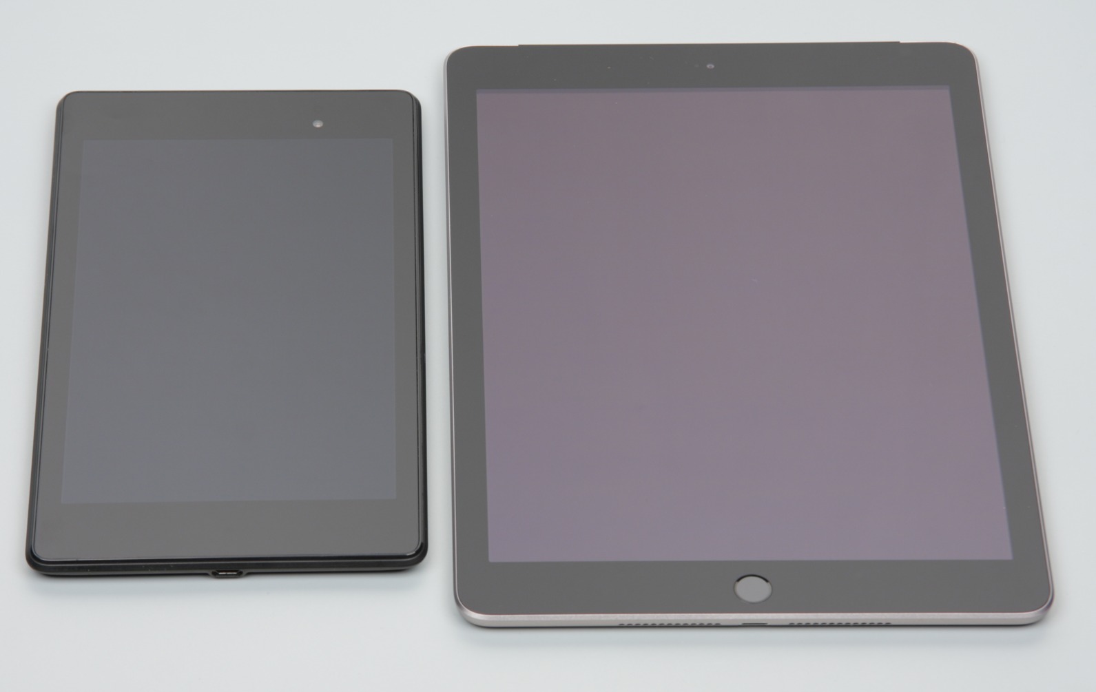 Лицевая поверхность экрана выполнена в виде стеклянной пластины с зеркально-гладкой поверхностью, устойчивой к появлению царапин. Судя по отражению объектов, антибликовые свойства экрана хуже, чем у экрана Google Nexus 7 (2013) (далее просто Nexus 7). Для наглядности приведем фотографию, на которой в выключенных экранах отражается белая поверхность (слева — Nexus 7, справа — Apple iPad (A1823), далее на всех сравнительных фотографиях их можно различать по размеру):