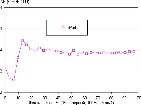 Экран iPad 1 и 2 хоть в чем-то лучше нового, пусть и по мелочи: цветовая температура чуть-чуть ближе к стандартным 6500 К, дельта Е меньше и слабее изменяется при переходе от белого к оттенкам серого.