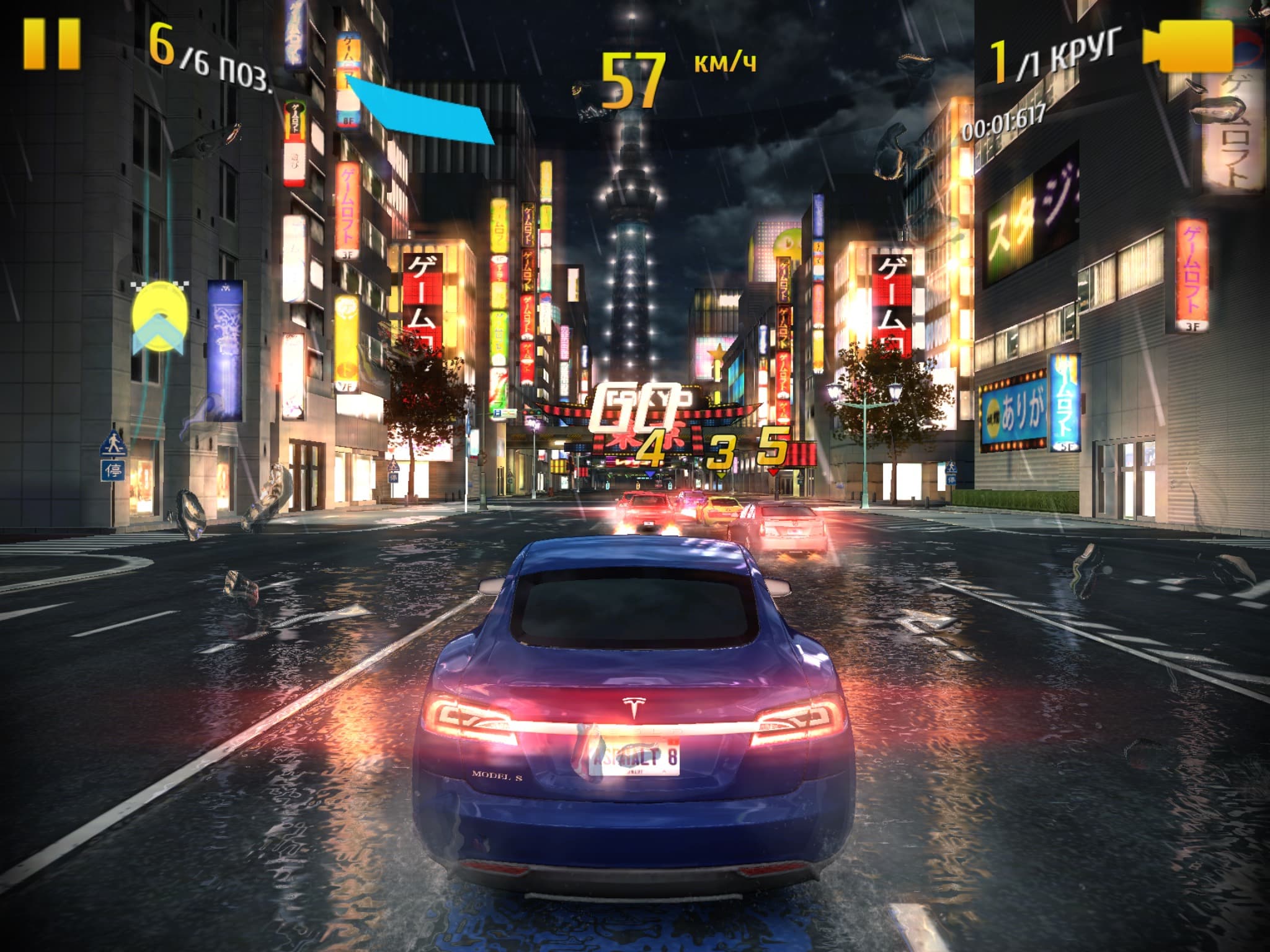 Видно, что на iPad Air 2 есть как минимум два новых эффекта, которых не было раньше: дождь и огонь из-под шин (см. машину под номером 4). На самом деле, на скриншотах это даже хуже заметно, в реальности же дождь сразу бросается в глаза и выглядит превосходно (капли падают на мокрый асфальт, растекаются по лобовому стеклу, отлетают от корпуса машины...). Да и снопы искр из-под шин (в момент старта, при использовании нитро) первое время привлекает внимание.