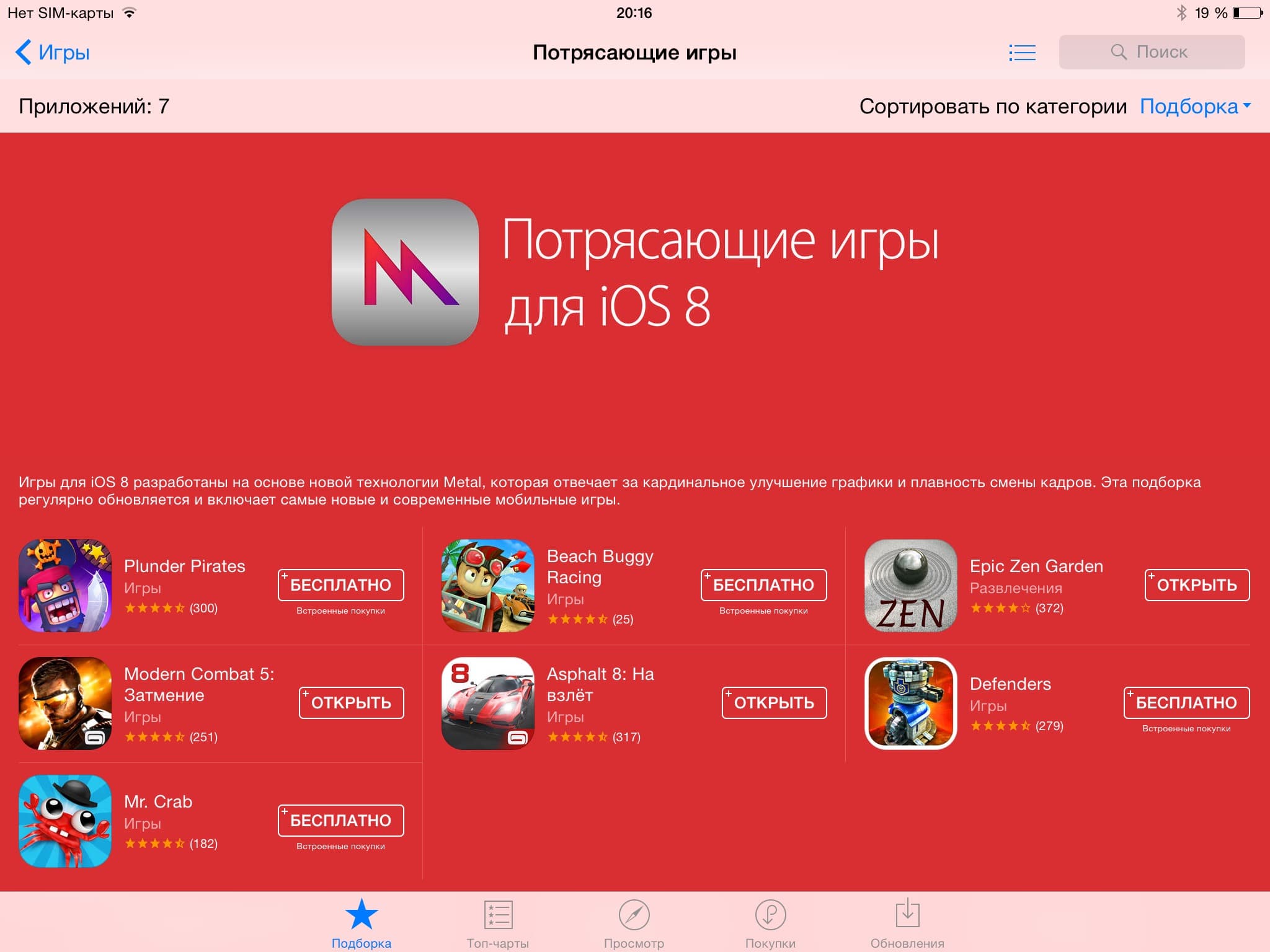 В скором времени это станет еще более наглядно благодаря появлению технологии Metal. Это низкоуровневый API для GPU, заменяющий OpenGL ES и позволяющий более эффективно задействовать GPU новых SoC Apple (начиная с Apple A7, при этом требуется iOS 8 и новее). Проще говоря, игры, использующие Metal, могут быть более красивыми и производительными. Apple анонсировала Metal на летней конференции для разработчиков WWDC, и в App Store уже появилось несколько наименований, использующих эту технологию.