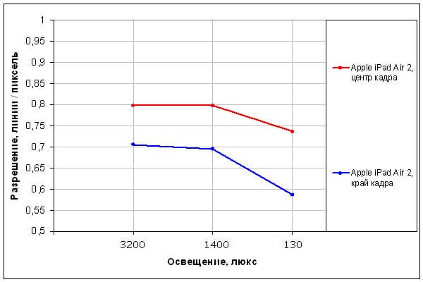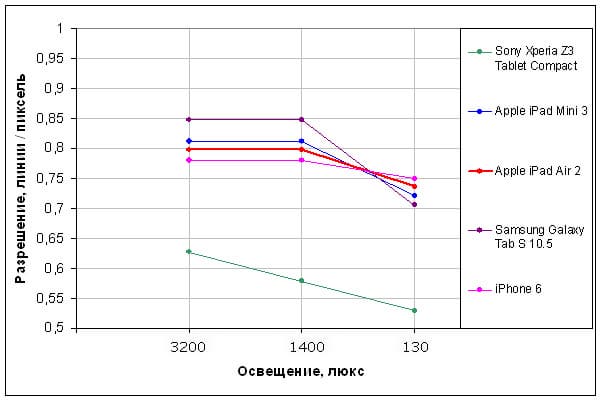 Если исходить из размера снимка, можно предположить, что iPad Air 2, Galaxy Tab S 10.5 и Xperia Z3 Tablet Compact имеют одинаковые сенсоры. Учитывая, что последнее время подавляющее большинство применяемых сенсоров — производства Sony, забавно, что камеры работают так по-разному. Впрочем, вернемся к героям обзора. Как и ожидалось, Air 2 со съемкой стенда справился чуть хуже, чем mini 3, несмотря на большее разрешение сенсора. Это лишний раз подтверждает, что не всегда есть глубокий смысл в увеличении разрешения камеры. К тому же, в отличие от того же Tab S 10.5, камера не имеет вспышки, а значит, диапазон ее применений заметно сужается, особенно с учетом размеров устройства. С другой стороны, по сравнению с тем же iPhone 6 камера Air 2 даже немного лучше по разрешающей способности в центре. А вот на краю кадра разрешение ведет себя заметно хуже. Да и в целом смотрятся снимки не так здорово, как на iPhone 6.