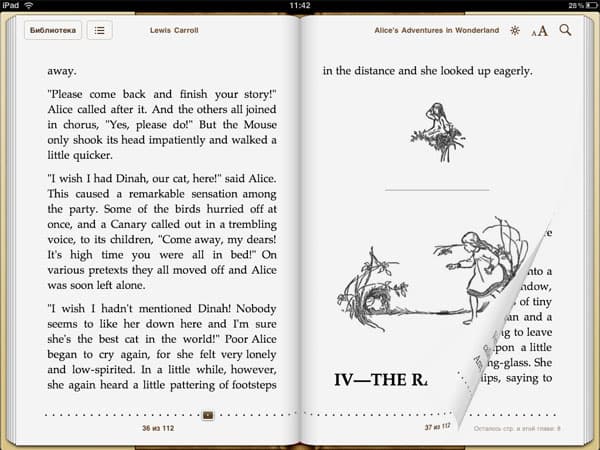 Совсем иное дело — iPad. Здесь у вас создается полная иллюзия того, что вы работаете с обычной книгой. Даже странички можно перелистывать не стрелочками (как на компьютере и в большинстве ридеров), а жестом, аналогичным листанию бумажных страниц. А еще можно легонько оттянуть уголок и заглянуть на следующую страницу. Выглядит это здорово, и поначалу вызывает восторг не меньший, чем фокусы «Алисы».