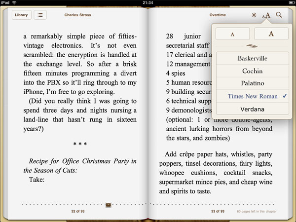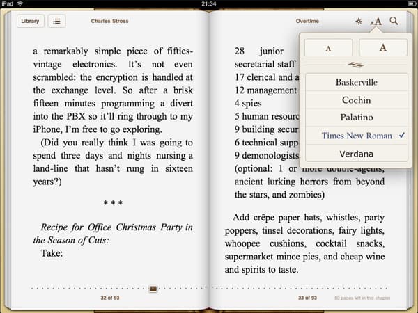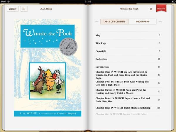 Но, разумеется, есть у «виртуальных» книг и те функции, которых нет и быть не может у бумажных аналогов. Например, моментальный переход к оглавлению (а из оглавления — к тексту главы) или строка с бегунком, позволяющим быстро найти нужную страницу. Можно спорить о том, приятнее ли читать книги на iPad или на ридерах E-Ink (не излучающих свет и меньше напрягающих зрение), но тот факт, что навигация в iPad гораздо удобнее, чем в любых ридерах, кажется неопровержимым. Причем, здесь все настолько понятно, что даже ребенок или пенсионер, никогда не работавший за компьютером, разберется, как пользоваться iBooks.
