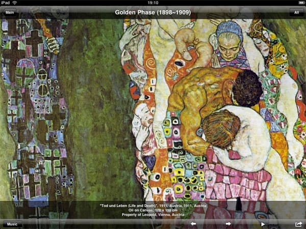 В Klimt HD используется JPEG довольно высокого качества. В качестве примера приводим одну картину (кликните по скриншоту над этим абзацем, и получите оригинальный файл). Размер файла — 444 килобайта, разрешение — 1280х1024. Для iPad этого вполне достаточно (напомним, что разрешение экрана iPad — 1024х768) . Есть изображения и большего разрешения. Таким образом, практически любую картину можно растянуть пальцами и рассмотреть детали (хотя, разумеется, для многократного увеличения этого уже недостаточно).