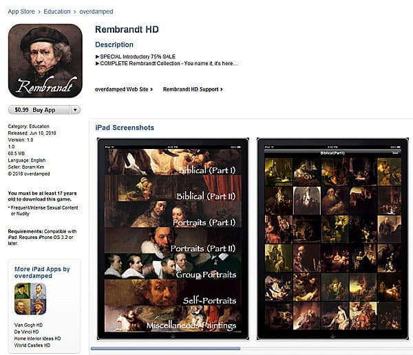 В AppStore доступен целый ряд приложений, которые представляют собой полные (или почти полные) собрания работ великих художников. На данный момент для iPad доступны собрания Ван Гога, Да Винчи, Климта, Рембрандта... Некоторое время назад был и Пикассо, но сейчас приложение Picasso HD куда-то исчезло (возможно, это связано с правовыми аспектами). Стоят такие приложения всего 99 центов, что, конечно же, не сравнимо ни с альбомом репродукций, ни даже с лицензионным компакт-диском или DVD аналогичного рода (помнится, несколько лет назад я с увлечением собирал такие диски).