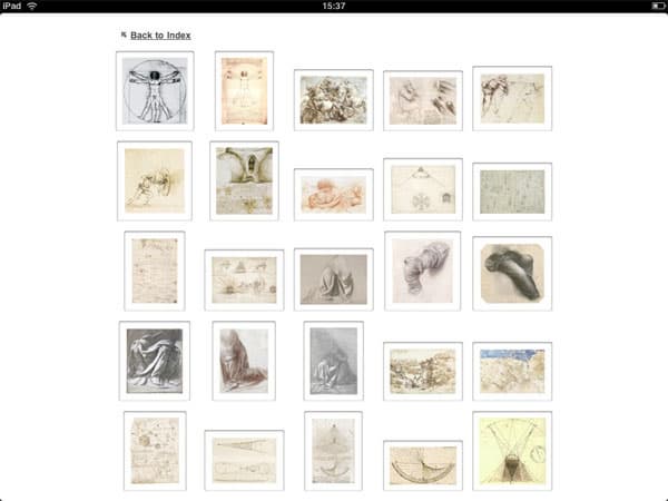 Увы, здесь нет ни информации о рисунках (когда и в какой связи были созданы, в какой книге их можно найти, где хранится оригинал, на какой бумаге и чем нарисовано...), ни возможности увеличить рисунок (привычный жест двумя пальцами не работает). А ведь в своем максимальном размере они раскрываются даже не на весь экран iPad! Это особенно раздражает в случае с чертежами, где не удается разглядеть ни одной буквы в рукописных пояснениях художника (коих на чертежах множество). Нельзя и экспортировать изображения. Таким образом, данное приложение (по цене равное Klimt HD) можно рекомендовать лишь для ознакомления, и в целом следует признать куда менее удачным, чем Klimt HD. Но некоторые особенности навигации разработчики Klimt HD могли бы и взять на заметку!