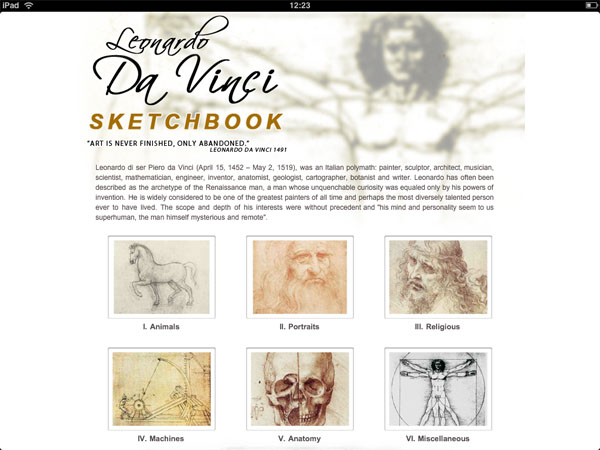 Еще одно приложение подобного рода (но уже от другого разработчика) — Leonardo da Vinci — Sketchbook Gallery. Это собрание эскизов и чертежей Леонардо да Винчи. Здесь несколько иная организация, нежели в Klimt HD.