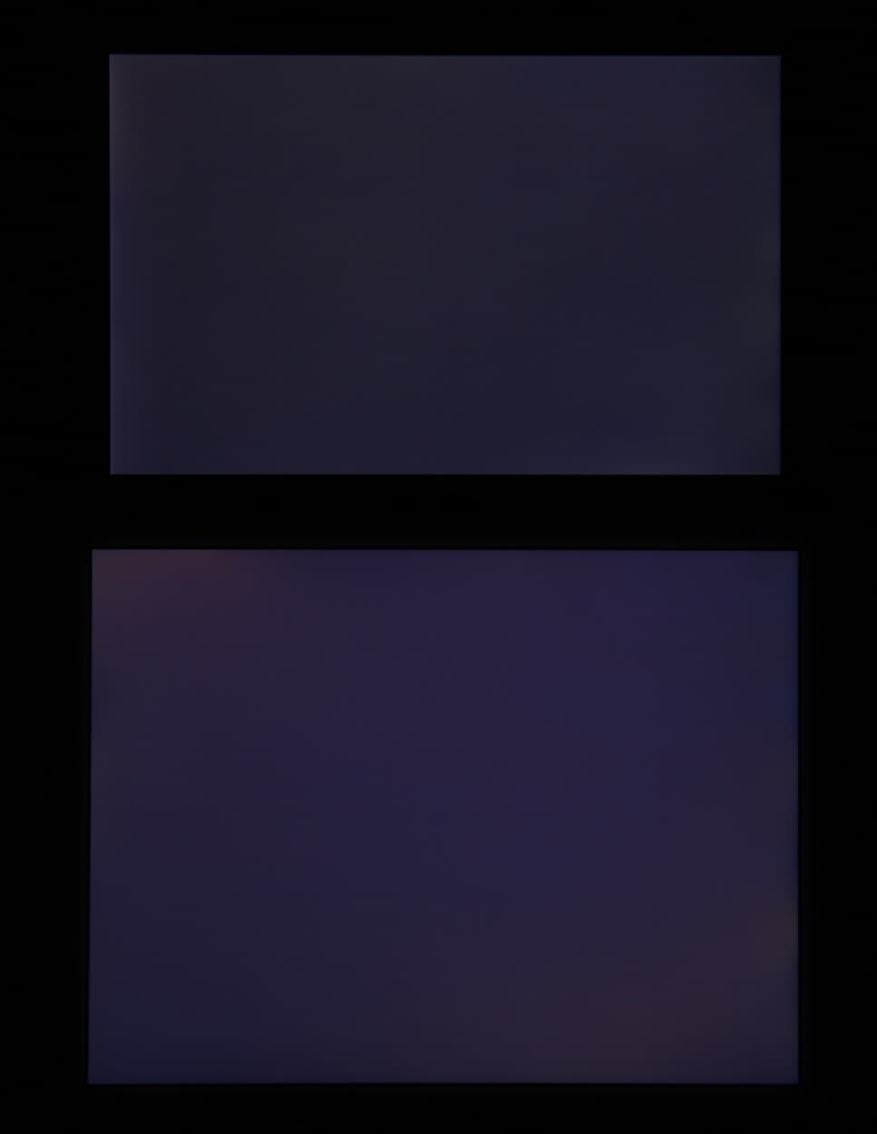 Яркость под углом у экранов уменьшилась (как минимум в 5 раз, исходя из разницы в выдержке), но в случае iPad mini 4 падение яркости меньше. Черное поле при отклонении по диагонали высветляется слабо и приобретает фиолетовый или красно-фиолетовый оттенок. Фотографии ниже это демонстрируют (яркость белых участков в перпендикулярном плоскости экранов направлении примерно одинаковая!):