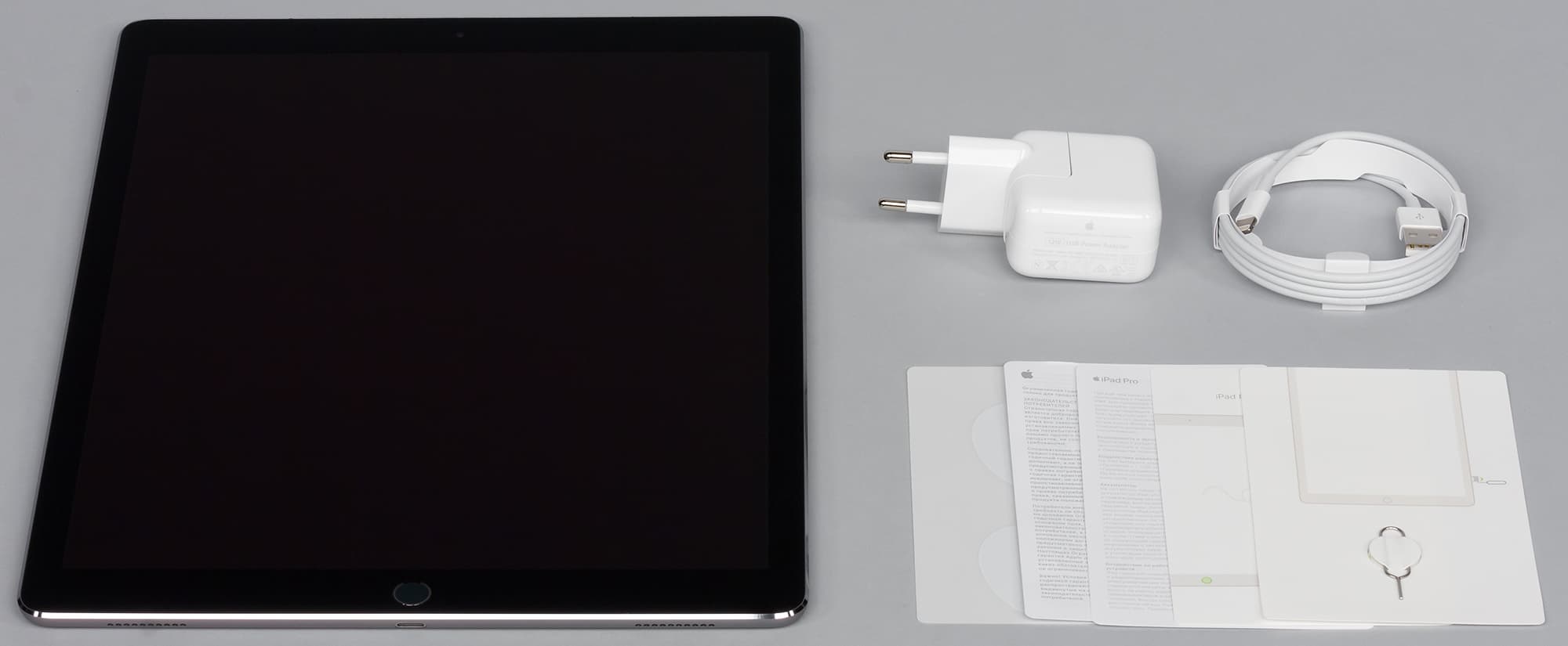 Что касается комплектации — здесь тоже никаких сюрпризов: листовки, зарядное устройство, кабель Lightning (честно говоря, он кажется коротковатым), наклейки и ключик для извлечения колыбельки SIM-карты. Зарядное устройство имеет такую же мощность, как и у iPad Pro 12,9″ прошлого поколения и iPad Pro 10,5″: 12 Вт (2,4 А, 5,2 В).