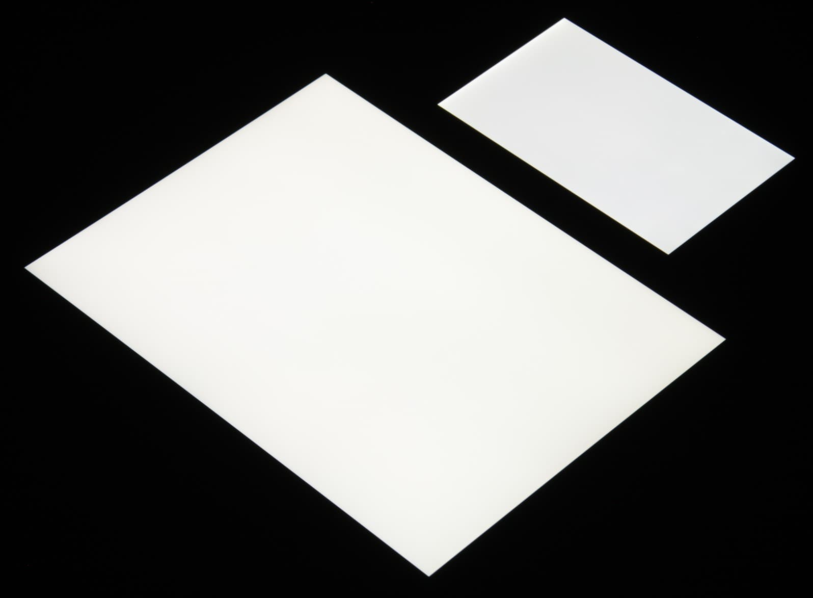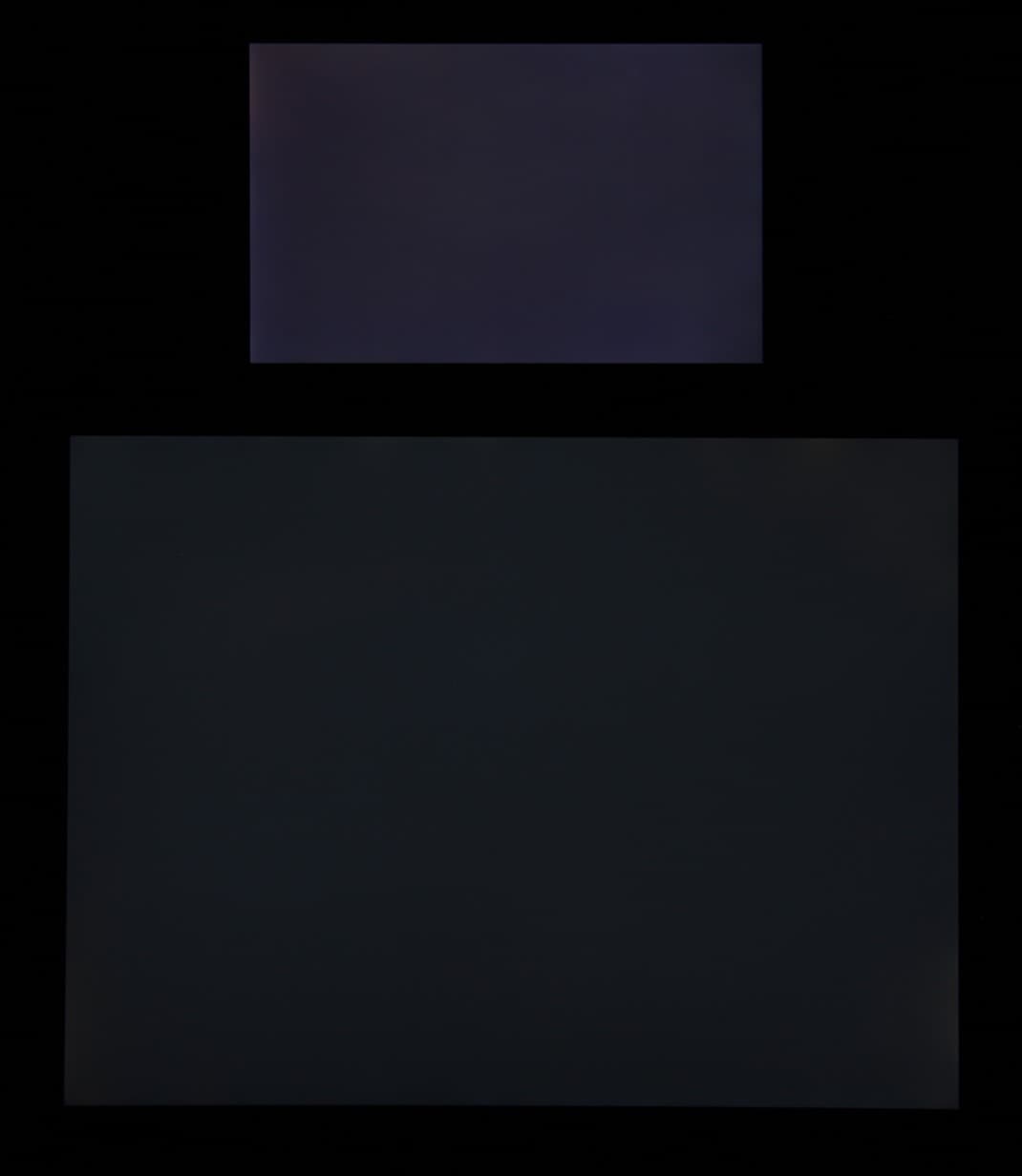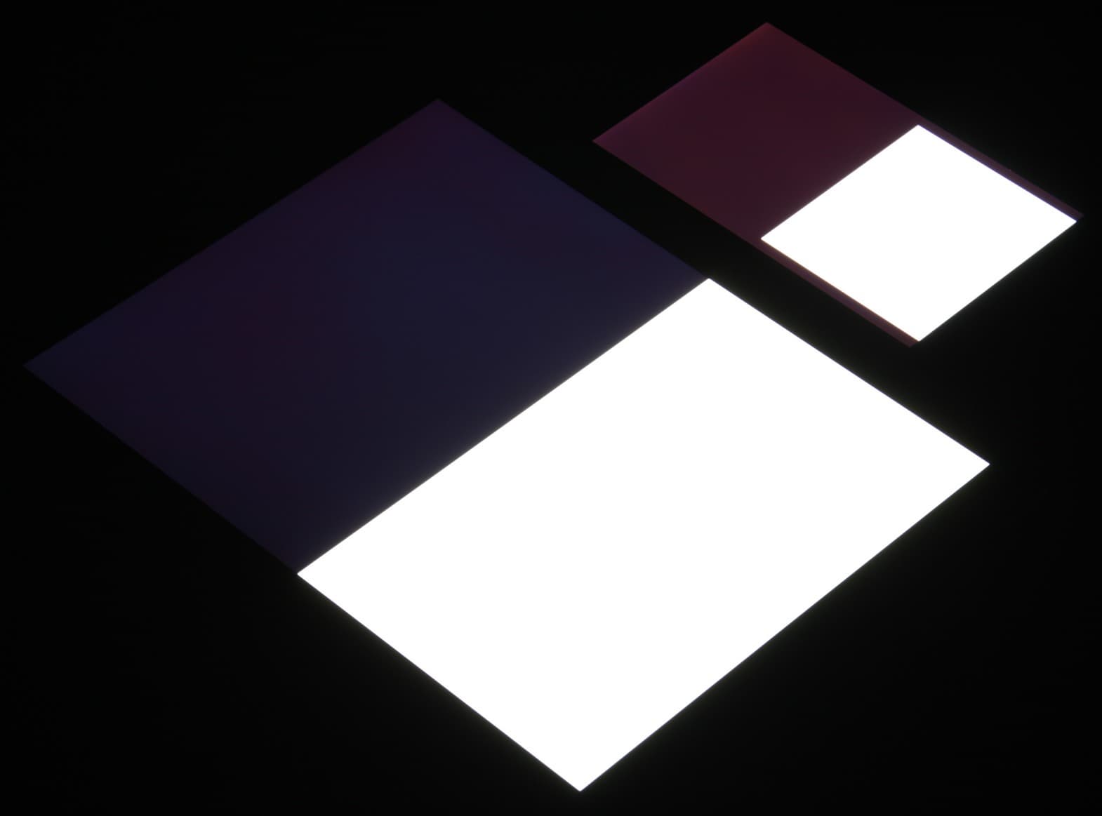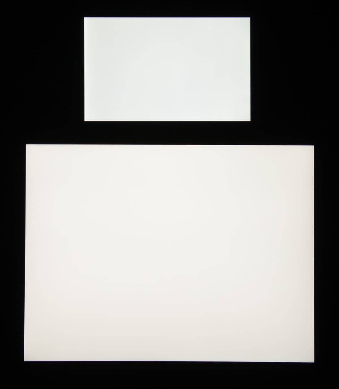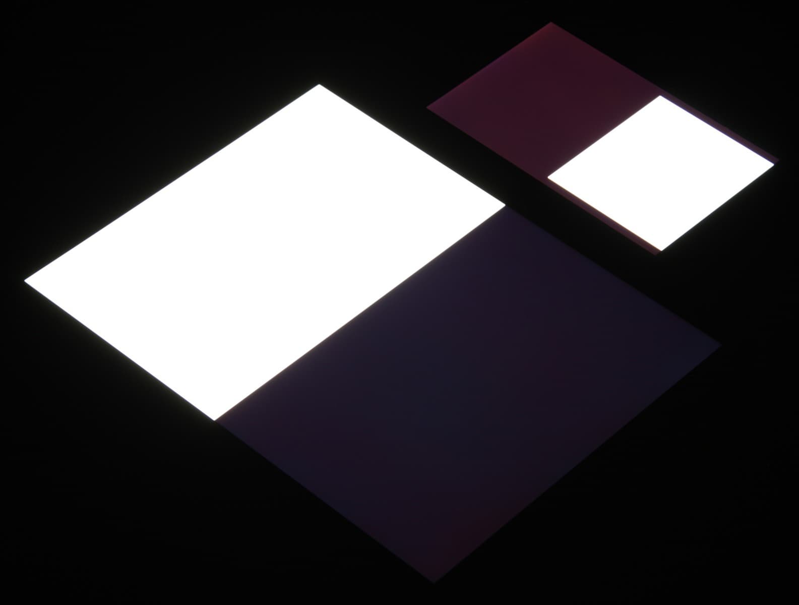 Яркость под углом у экранов уменьшилась (как минимум в 4-5 раз, исходя из разницы в выдержке), но в случае iPad Pro 12,9 падение яркости меньше. Черное поле при отклонении по диагонали высветляется очень слабо и приобретает фиолетовый оттенок. Фотографии ниже это демонстрируют (яркость белых участков в перпендикулярном плоскости экранов направлении примерно одинаковая!):
