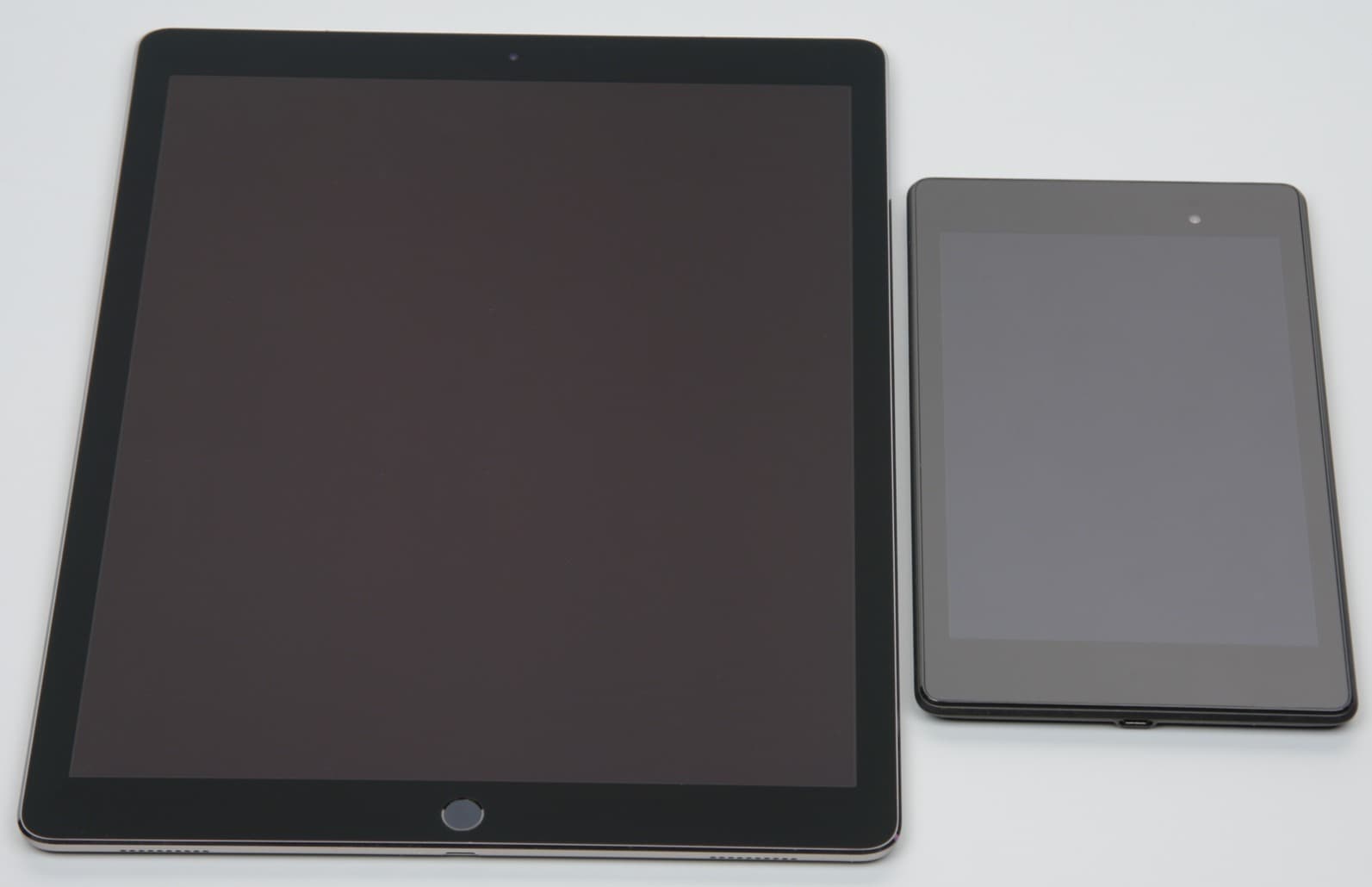 Лицевая поверхность экрана выполнена в виде стеклянной пластины с зеркально-гладкой поверхностью, устойчивой к появлению царапин. Судя по отражению объектов антибликовые свойства экрана гораздо лучше, чем у экрана Google Nexus 7 (2013) (далее просто Nexus 7). Для наглядности приведем фотографию, на которой в выключенных экранах отражается белая поверхность (справа — Nexus 7, слева — iPad Pro 12,9, далее их можно различать по размеру):