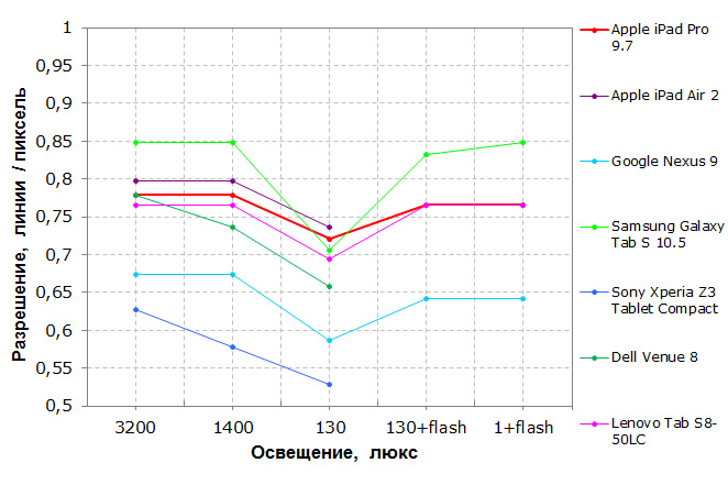 В целом, камеру можно оценить положительно, хотя край кадра не так хорош, как у камеры iPhone, да и с фокусировкой в темноте возникают большие трудности. В остальном камера не уступает актуальным смартфонам Apple и отлично справится с различными сюжетами. Радует, что Apple теперь не менее серьезно относится к камере своих флагманских планшетов, чем Samsung, которая уже давно использует вспышку в планшетах и ставит модули более высокого разрешения, чем 8 Мп.