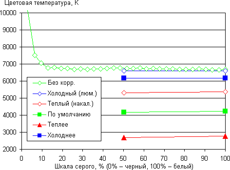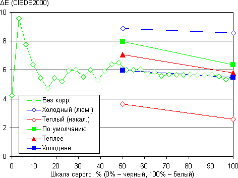 Баланс оттенков на шкале серого хороший, так как цветовая температура несильно выше стандартных 6500 К, а отклонение от спектра абсолютно черного тела (ΔE) меньше 10, что для потребительского устройства считается приемлемым показателем. При этом цветовая температура и ΔE мало изменяются от оттенка к оттенку — это положительно сказывается на визуальной оценке цветового баланса. (Самые темные области шкалы серого можно не учитывать, так как там баланс цветов не имеет большого значения, да и погрешность измерений цветовых характеристик на низкой яркости большая.)