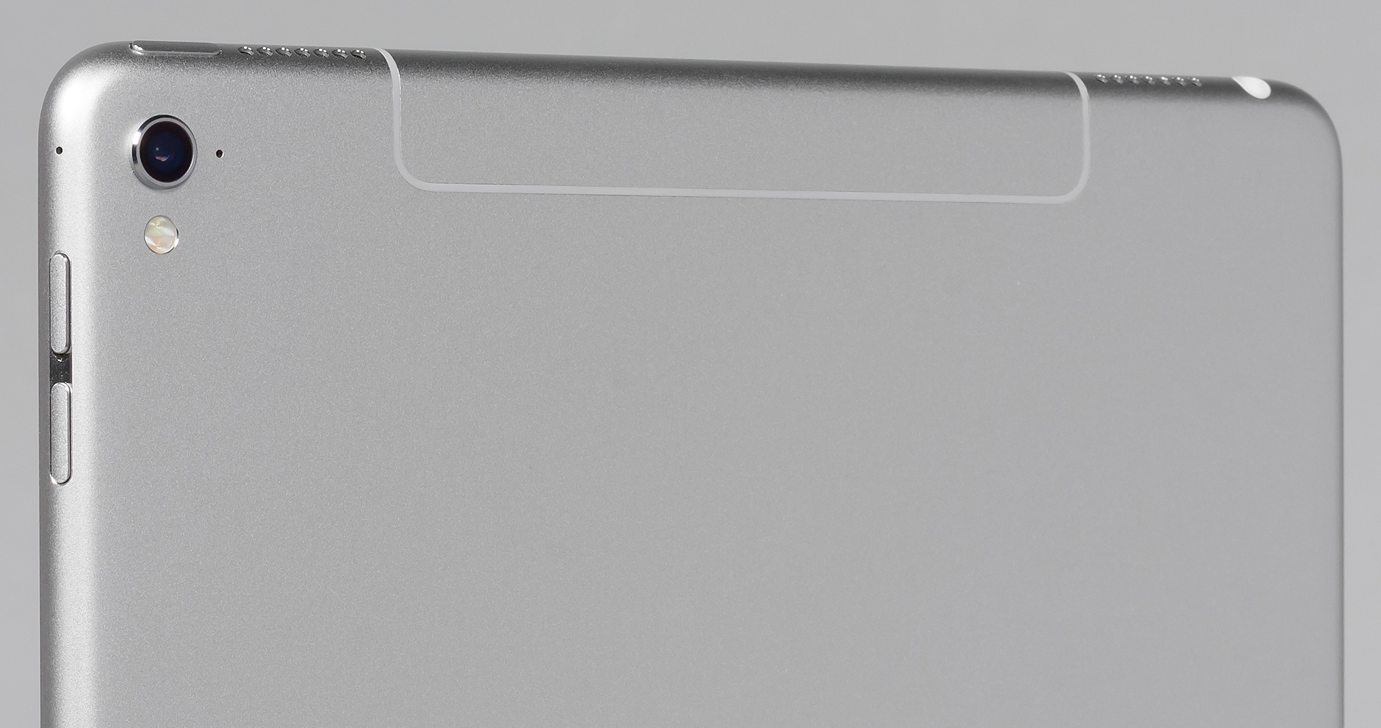 Здесь есть два важных отличия. Первое: как и большой iPad Pro, новинка оснащена стереодинамиками. Два динамика расположены на нижней грани, два — на верхней. Поэтому при просмотре фильма вы получаете оптимальную направленность звука. На этой фотографии видно два динамика сверху — у iPad Air 2 их не было. Кроме того, сама пластиковая вставка для сотового модуля выглядела иначе. Здесь это — лишь тонкая пластиковая полоска, а раньше вся эта зона была из белого пластика.