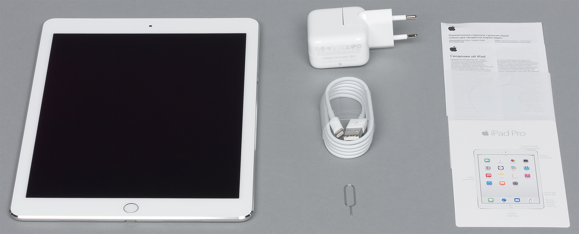 Что касается комплектации — здесь тоже никаких сюрпризов: листовки, зарядное устройство, кабель Lightning, наклейки и ключик для извлечения колыбельки SIM-карты. Зарядное устройство имеет такую же мощность, как и у iPad Air 2: 10 Вт (2,1 А, 5,1 В).