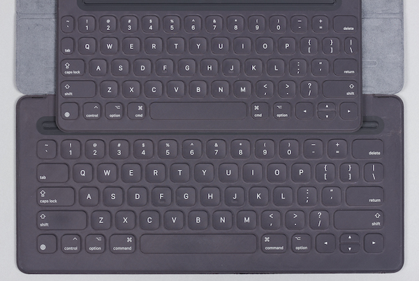 Напомним, что Apple Smart Keyboard полностью заменяет фирменную обложку Smart Cover, защищая экран и позволяя устанавливать планшет под углом, и заодно превращает планшет в подобие нетбука. Но увы, из-за уменьшенных размеров на новой клавиатуре не удается печатать вслепую столь же комфортно, как на клавиатуре для iPad Pro 12,9″. Ниже на фото наглядно показано соотношение размеров двух клавиатур.