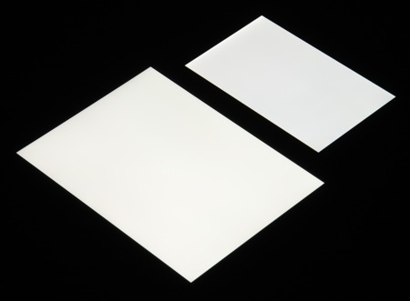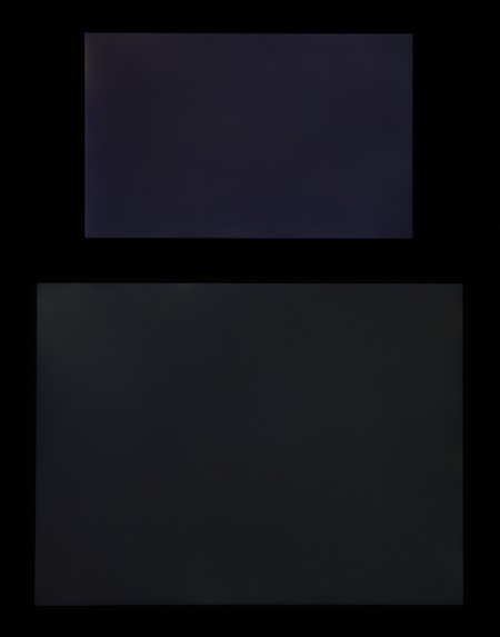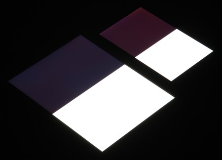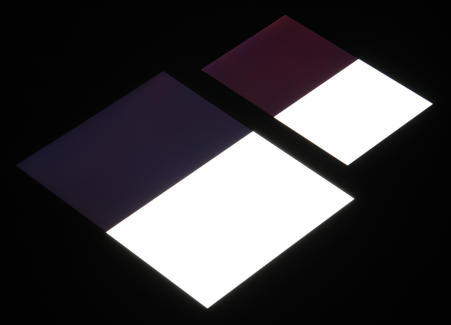 Яркость под углом у экранов уменьшилась (как минимум в 4 раза, исходя из разницы в выдержке), но в случае iPad Pro 9,7 падение яркости меньше. Черное поле при отклонении по диагонали высветляется слабо и приобретает фиолетовый оттенок. Фотографии ниже это демонстрируют (яркость белых участков в перпендикулярном плоскости экранов направлении примерно одинаковая!):