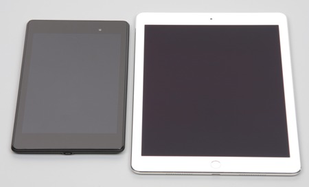 Лицевая поверхность экрана выполнена в виде стеклянной пластины с зеркально-гладкой поверхностью, устойчивой к появлению царапин. Судя по отражению объектов, антибликовые свойства экрана гораздо лучше, чем у экрана Google Nexus 7 (2013) (далее просто Nexus 7). Для наглядности приведем фотографию, на которой в выключенных экранах отражается белая поверхность (слева — Nexus 7, справа — iPad Pro 9,7, далее на всех сравнительных фотографиях их можно различать по размеру):