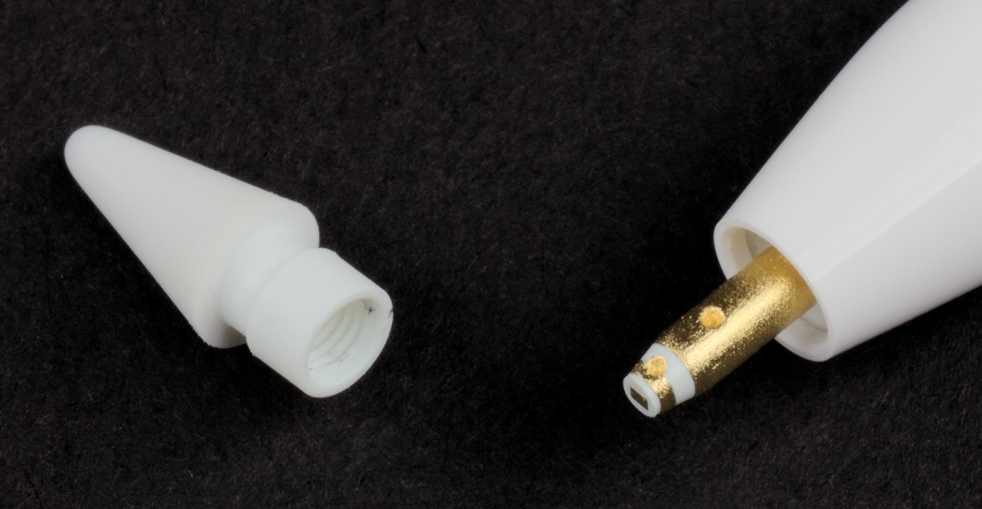 Если мы откроем колпачок, то под ним обнаружим штекер Lightning. Этот штекер нужен для подсоединения стилуса к iPad Pro. Просто вставляем стилус в разъем Lightning на iPad Pro — и он начинает заряжаться (внутри стилуса — аккумулятор). Причем для того, чтобы можно было поработать несколько часов, стилус достаточно подержать подсоединенным к iPad всего полминуты.