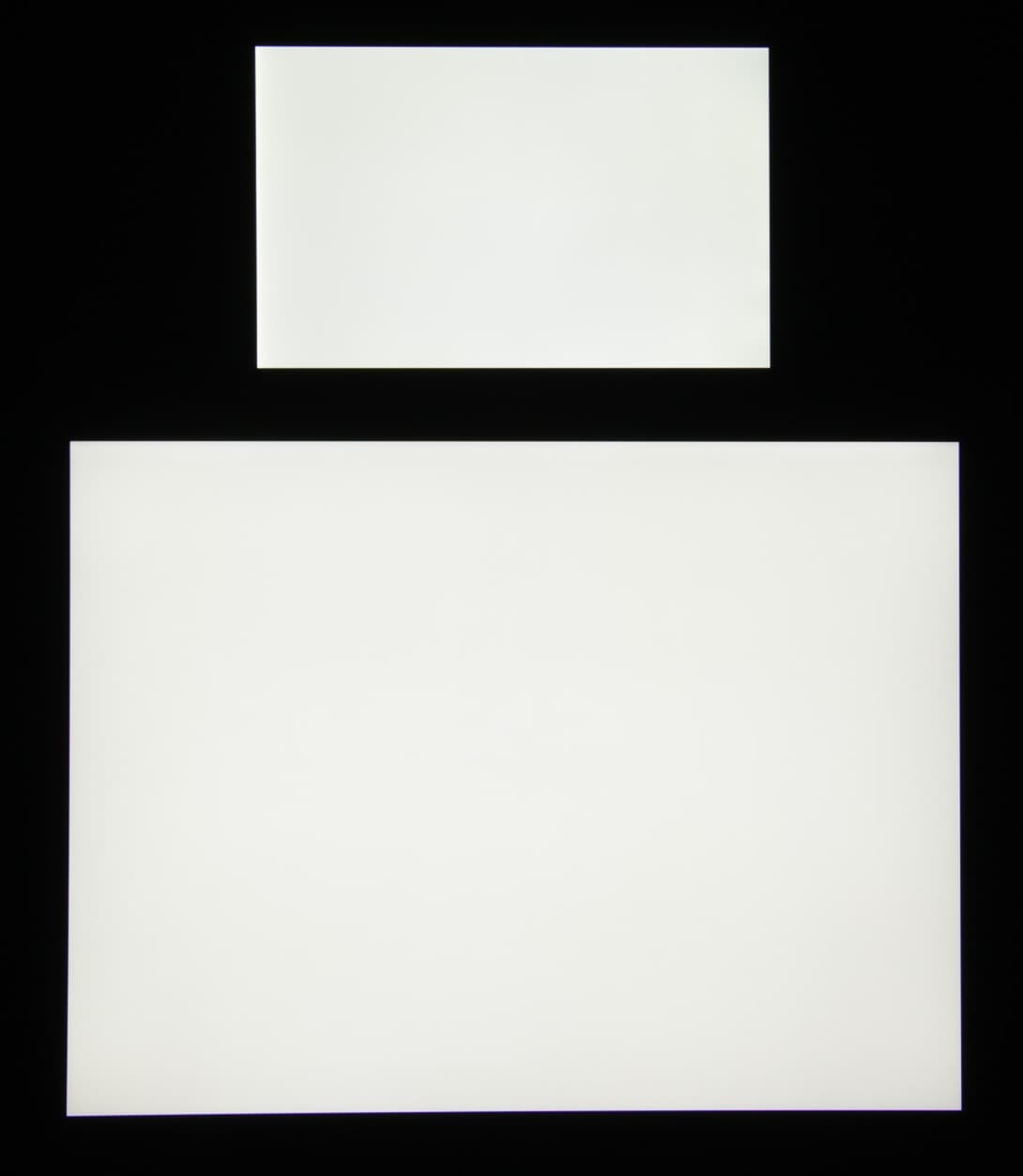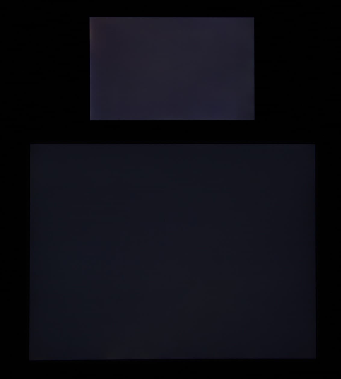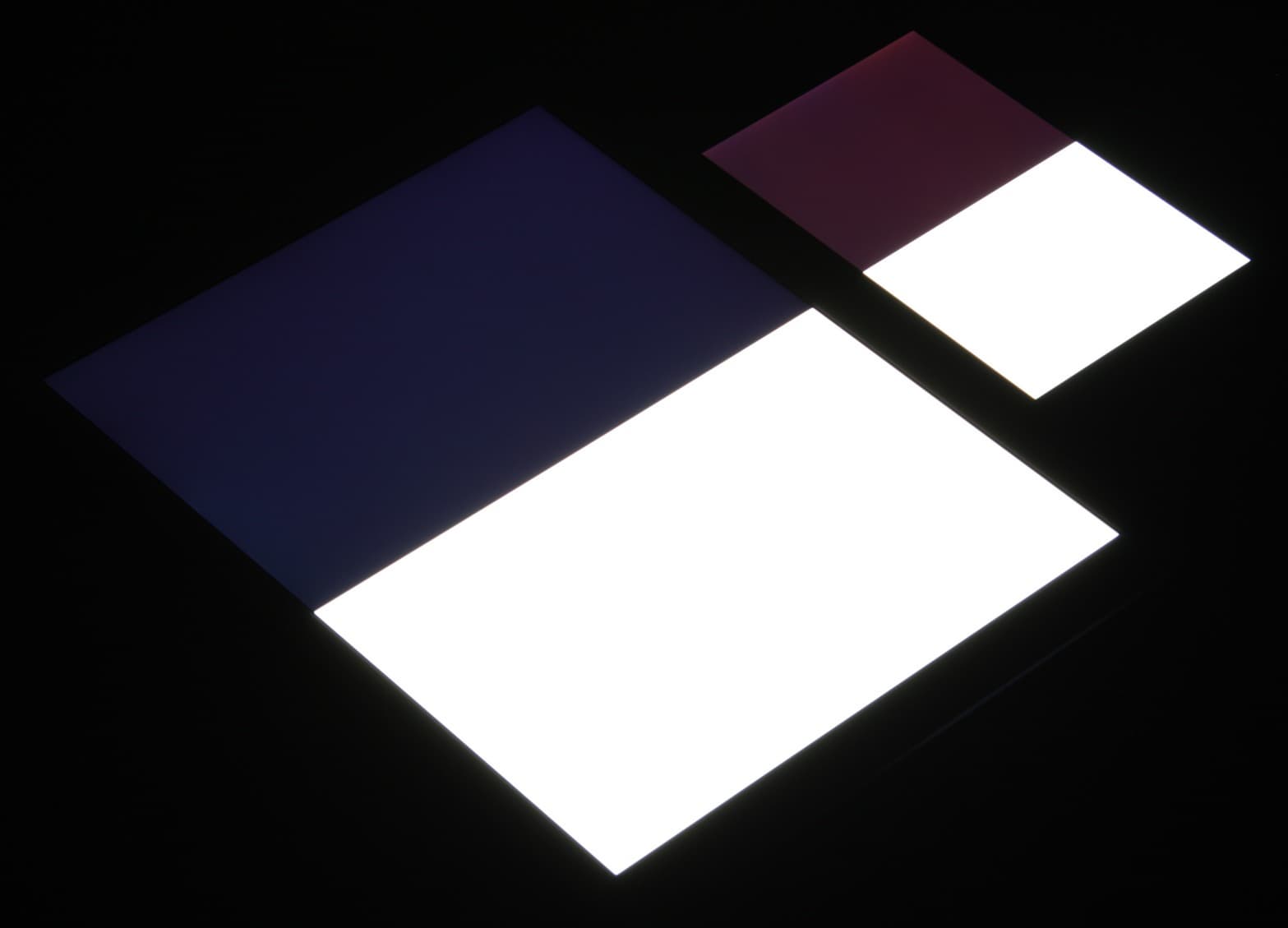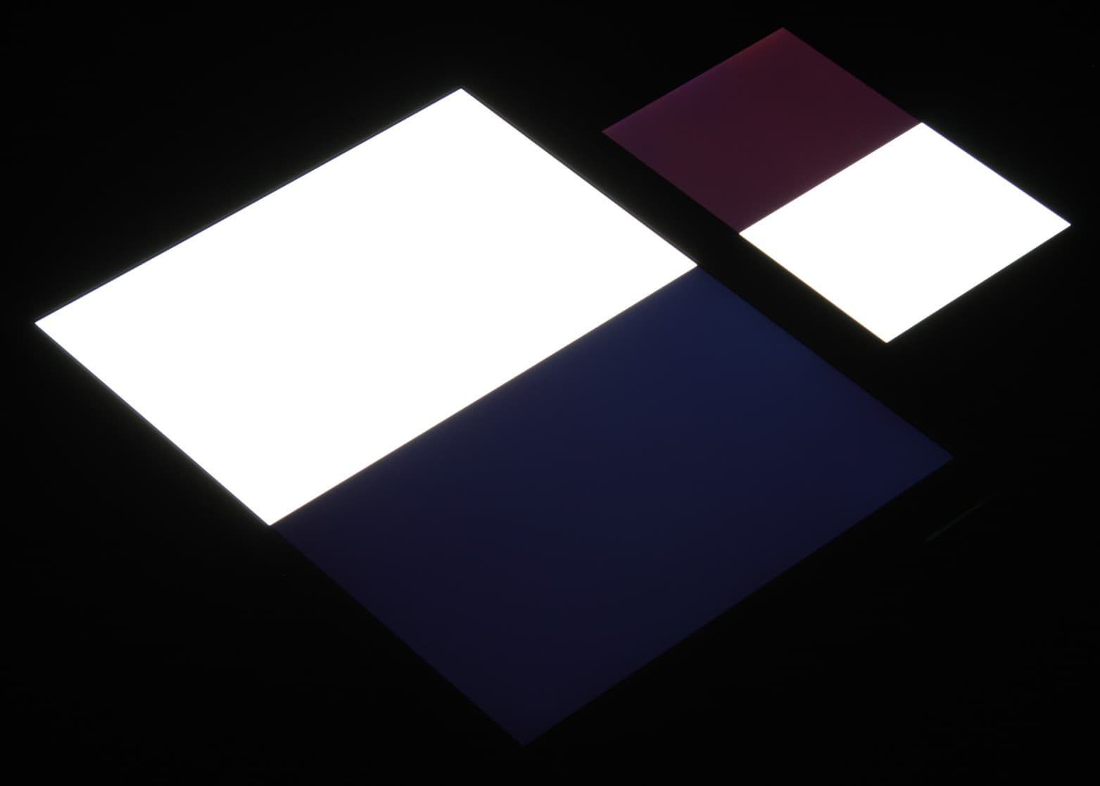 Яркость под углом у экранов уменьшилась (как минимум в 4 раза, исходя из разницы в выдержке), но в случае iPad Pro падение яркости меньше. Черное поле при отклонении по диагонали высветляется слабо и приобретает фиолетовый оттенок. Фотографии ниже это демонстрируют (яркость белых участков в перпендикулярном плоскости экранов направлении примерно одинаковая!):