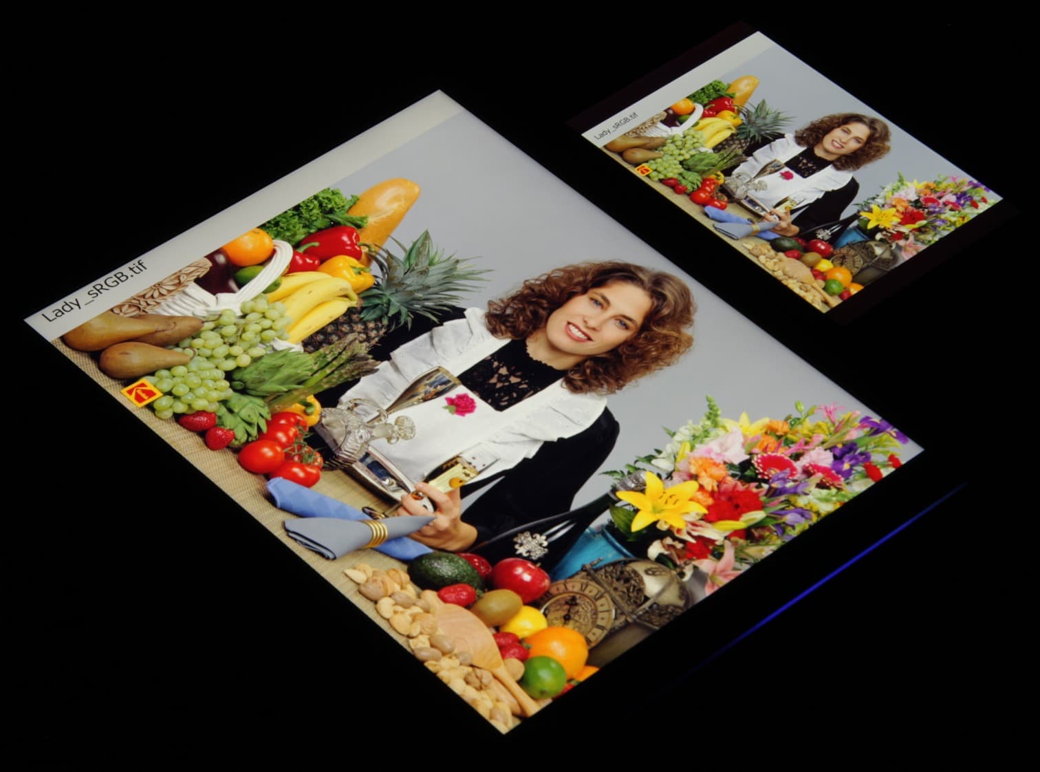 Экран имеет хорошие углы обзора без значительного сдвига цветов даже при больших отклонениях взгляда от перпендикуляра к экрану и без инвертирования оттенков. Для сравнения приведем фотографии, на которых на экраны iPad Pro и Nexus 7 выведены одинаковые изображения, при этом яркость экранов изначально установлена примерно на 200 кд/м² (по белому полю во весь экран, на iPad Pro это соответствует значению 65% яркости при использовании сторонних программ), а цветовой баланс на фотоаппарате принудительно переключен на 6500 К. Перпендикулярно к экранам белое поле: