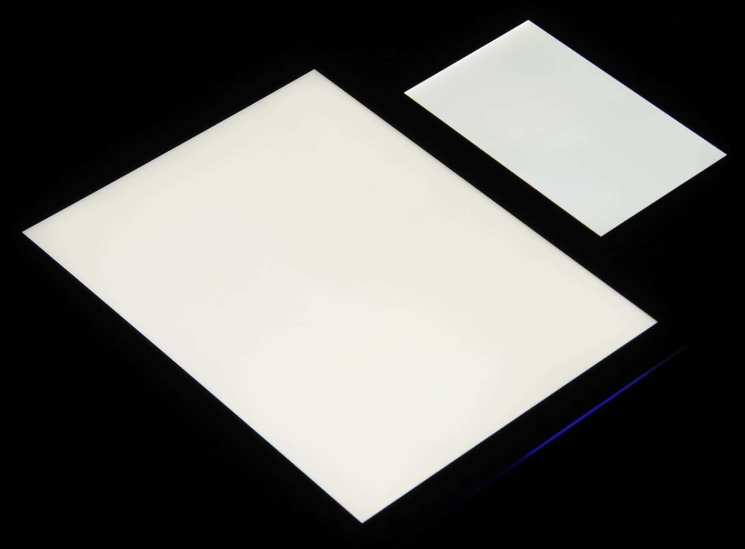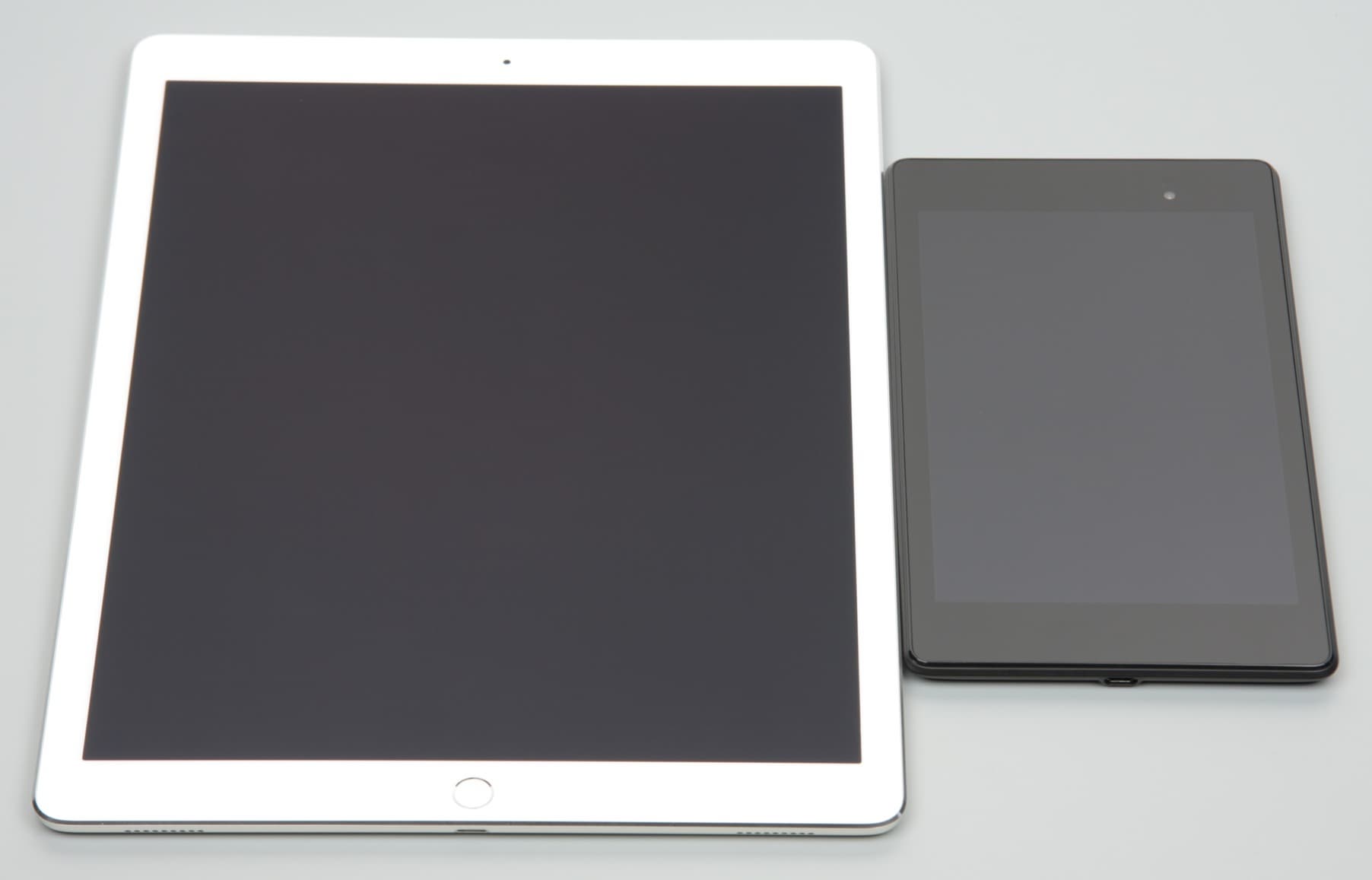 Лицевая поверхность экрана выполнена в виде стеклянной пластины с зеркально-гладкой поверхностью, устойчивой к появлению царапин. Судя по отражению объектов, антибликовые свойства экрана гораздо лучше, чем у экрана Google Nexus 7 (2013) (далее просто Nexus 7). При этом некоторый оттенок поверхности экрана, проявляющийся под большими углами, дает повод предположить, что в случае iPad Pro применяется какое-то антибликовое покрытие. Отрицательным свойством наличия этого покрытия является то, что заметность любых загрязнений на поверхности экрана повышается. Для наглядности приведем фотографию, на которой в выключенных экранах отражается белая поверхность (справа — Nexus 7, слева — iPad Pro, далее на всех сравнительных фотографиях их можно различать по размеру):