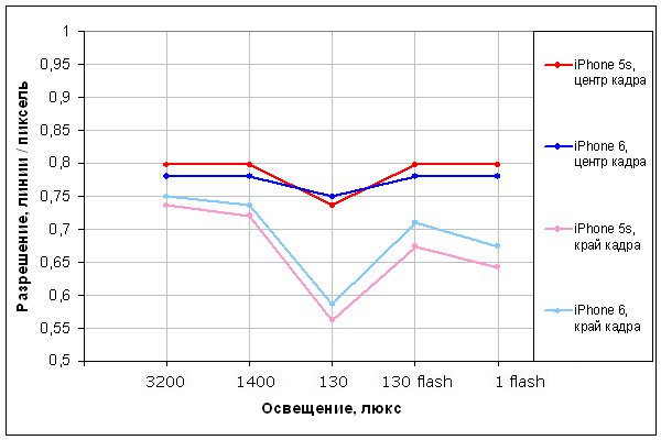 Ну что ж, все не так уж плохо. Модуль действительно хорош, но если год назад он еще соревновался с флагманами других производителей и даже побеждал, то теперь он безнадежно отстает. Он не намного хуже, но «безнадежно» — это именно то слово, отражающее трехлетнее бездействие и отсутствие стремления к улучшениям. Лабораторный тест подтверждает наши наблюдения. Судя по всему, вспышка справляется немного хуже при плохом освещении, чем в случае 5s. Вероятно, вносит свою лепту программа, несколько изменившаяся с обновлением операционной системы. Но глобальных изменений не произошло. В пределах погрешности измерения можно сказать, что камеры 5s и 6 идентичны. Как это ни прискорбно, камера iPhone 6 находится в среднем на уровне камер Samsung Galaxy S5 и Oppo Find 7, но уже при сравнении с LG G3 она заметно проигрывает.