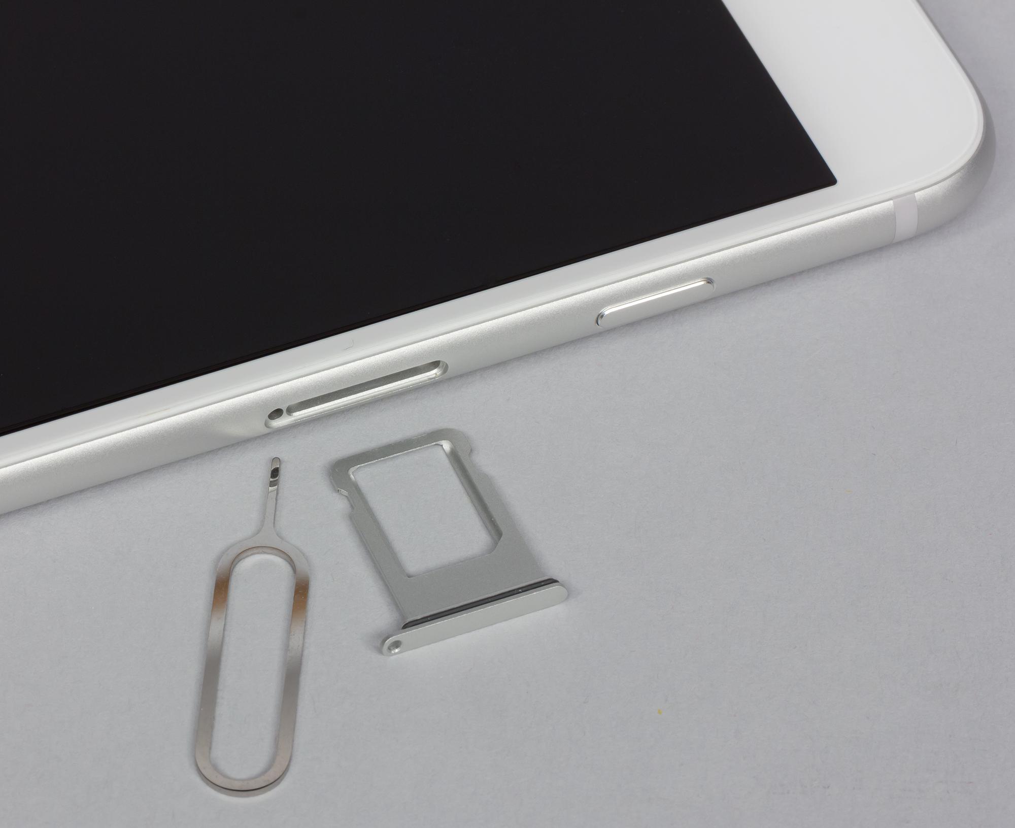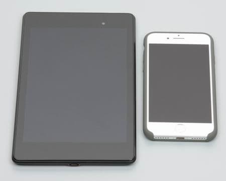 Лицевая поверхность экрана выполнена в виде стеклянной пластины с зеркально-гладкой поверхностью, устойчивой к появлению царапин. Судя по отражению объектов антибликовые свойства экрана лучше, чем у экрана Google Nexus 7 (2013) (далее просто Nexus 7). Для наглядности приведем фотографию, на которой в выключенных экранах отражается белая поверхность (слева — Nexus 7, справа — Apple iPhone 8, далее их можно различать по размеру):