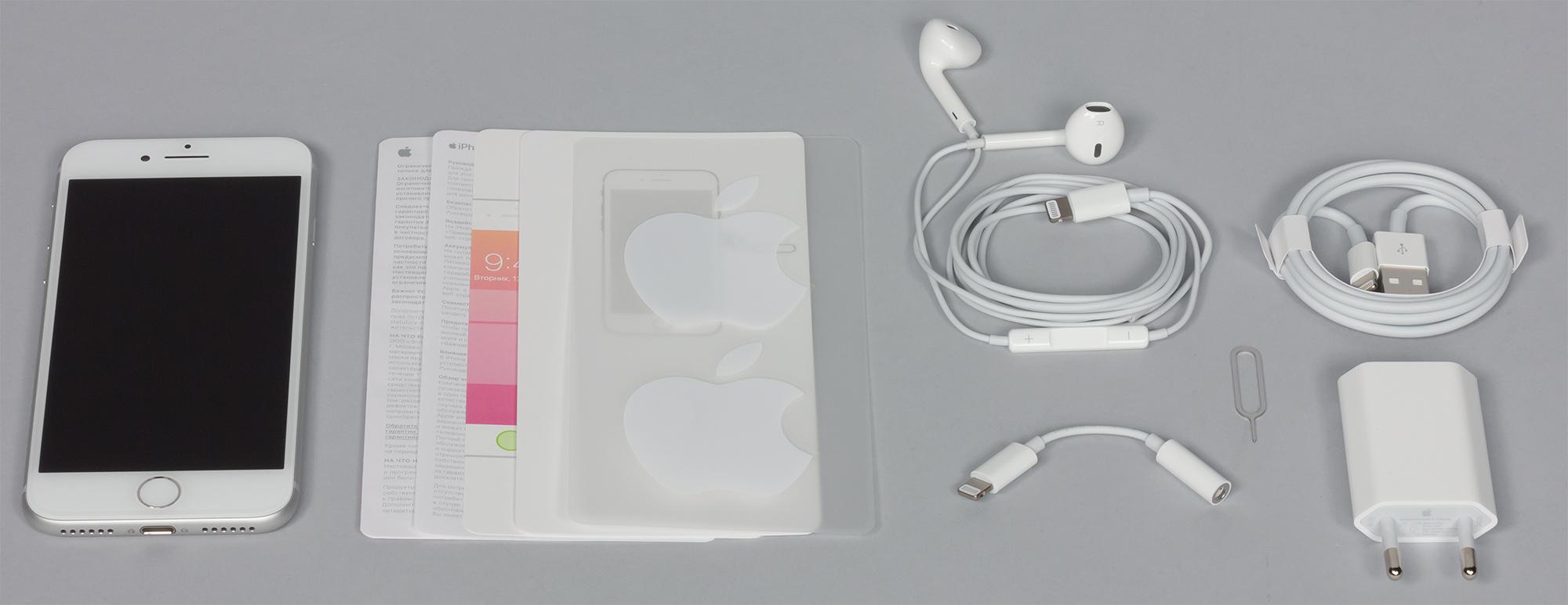 Внутри — тоже ничего нового: наушники EarPods с разъемом Lightning, переходник с Lightning на миниджек, листовки, зарядное устройство (5 В 1 А), кабель Lightning, наклейки и ключик для извлечения колыбельки SIM-карты.