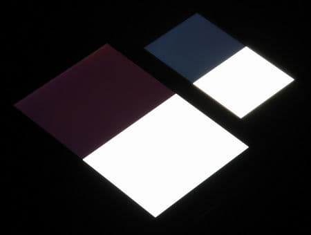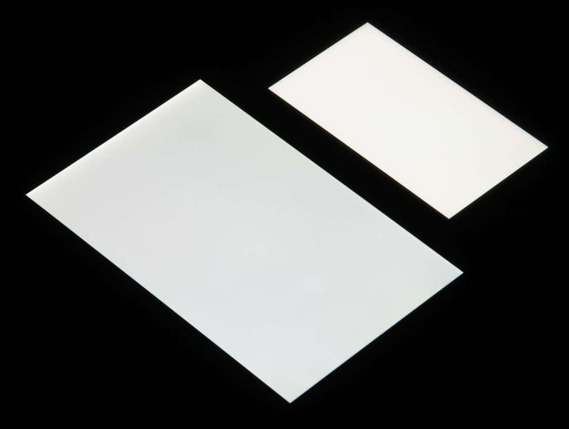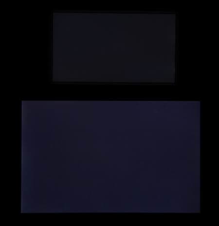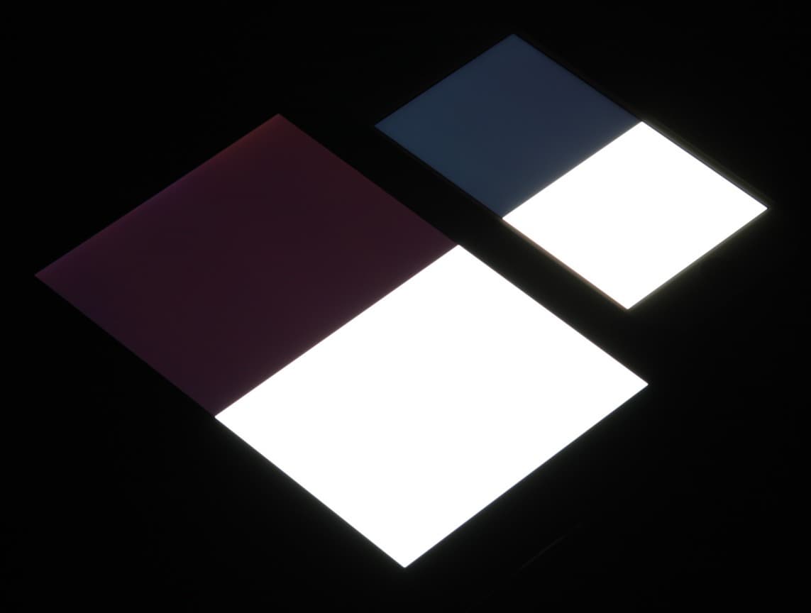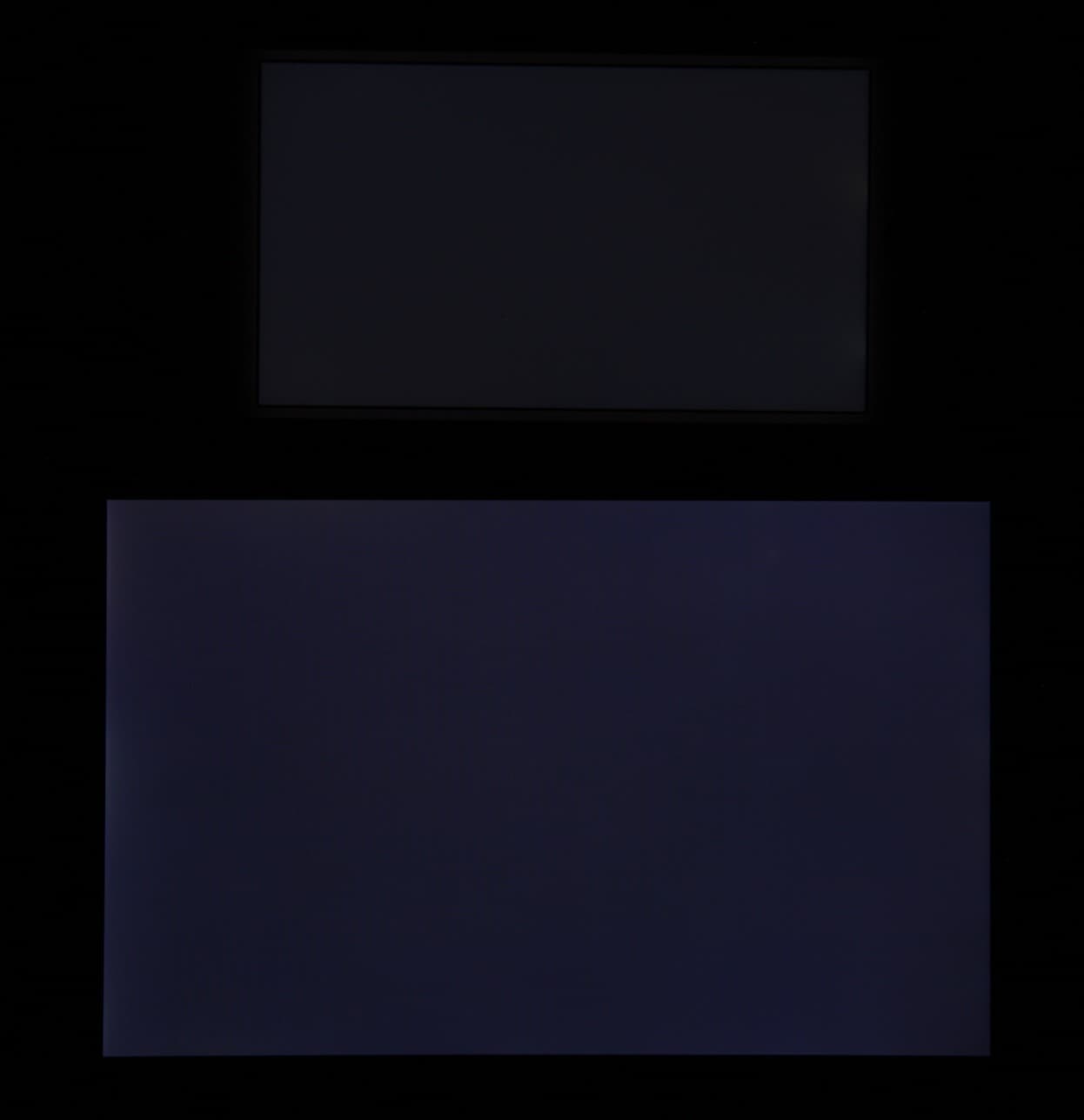 Яркость под углом у экранов уменьшилась (как минимум в 4 раза, исходя из разницы в выдержке), но в случае Apple iPhone 8 падение яркости меньше. Черное поле при отклонении по диагонали высветляется в средней степени и приобретает фиолетовый оттенок. Фотографии ниже это демонстрируют (яркость белых участков в перпендикулярном плоскости экранов направлении примерно одинаковая!):
