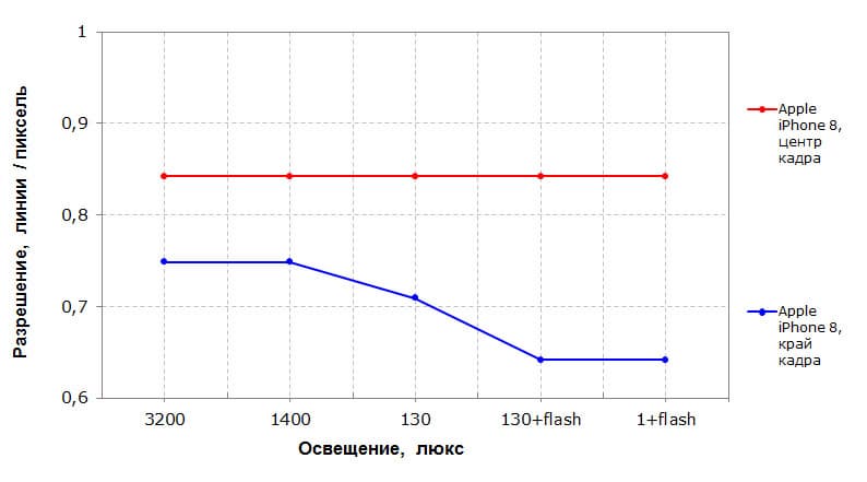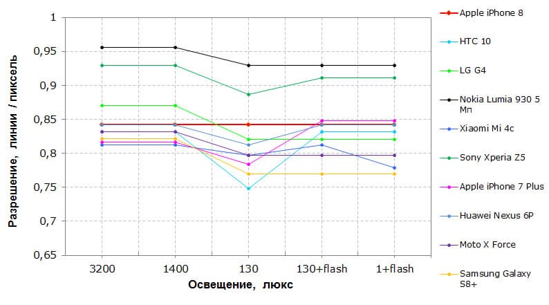 Наш стандартный тест не показал существенного роста максимального разрешения сенсора по сравнению с прошлыми поколениями. Однако, теперь камера значительно меньше деталей теряет в шумах при недостаточном освещении, что вполне можно назвать новым прорывом. Таким образом, при хорошем свете заметной разницы с тем же iPhone 7 не будет, зато при ухудшении освещения она сразу почувствуется. И даже вспышка здесь работает весьма эффективно: она не очень хорошо отрабатывает углы, но в центре кадра не дает разрешению упасть. Со всем остальным камера справляется хорошо, как и раньше: здесь неплохая детализация по полю кадра и по планам, умеренные шумы в тенях, не очень агрессивная программная обработка. В итоге, хорошую фотокамеру она, конечно, не заменит, в чем нас упорно пытается убедить производитель, но станет отличным инструментом для документальной и художественной съемки рядовых сюжетов.