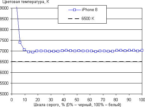 Присутствует функция True Tone, которая, если ее включить, подстраивает цветовой баланс под условия окружающей среды. К примеру, мы ее активировали и поместили смартфон под светодиодные светильники с холодным белым светом, получили в итоге значения 6,0 для ΔE и 7100 К для цветовой температуры. Под галогеновой лампой накаливания (теплый свет) — 3,7 и 6260 К, то есть цветовая температура стала ниже. Функция работает так, как и ожидалось. Отметим, что сейчас сложившимся стандартом является калибровка устройств отображения к точке белого в 6500 К, но в принципе, коррекция под цветовую температуру внешнего света может принести пользу, если хочется добиться лучшего соответствия изображения на экране с тем, что видно на бумаге (или на любом носителе, на котором цвета формируются за счет отражения падающего света) в текущих условиях.